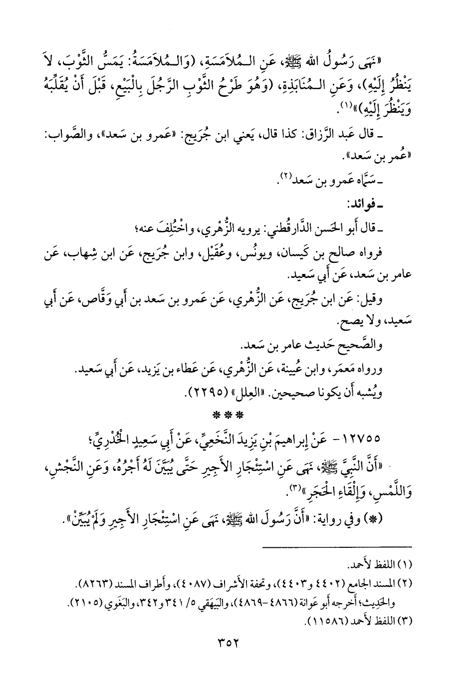 - سُئل الدارقُطني عن حديث عامر بن سعد، عن أَبي سعيد، عن النبي صَلى الله عَليه وسَلم في النهي عن المُلامسة والمُنابذة.