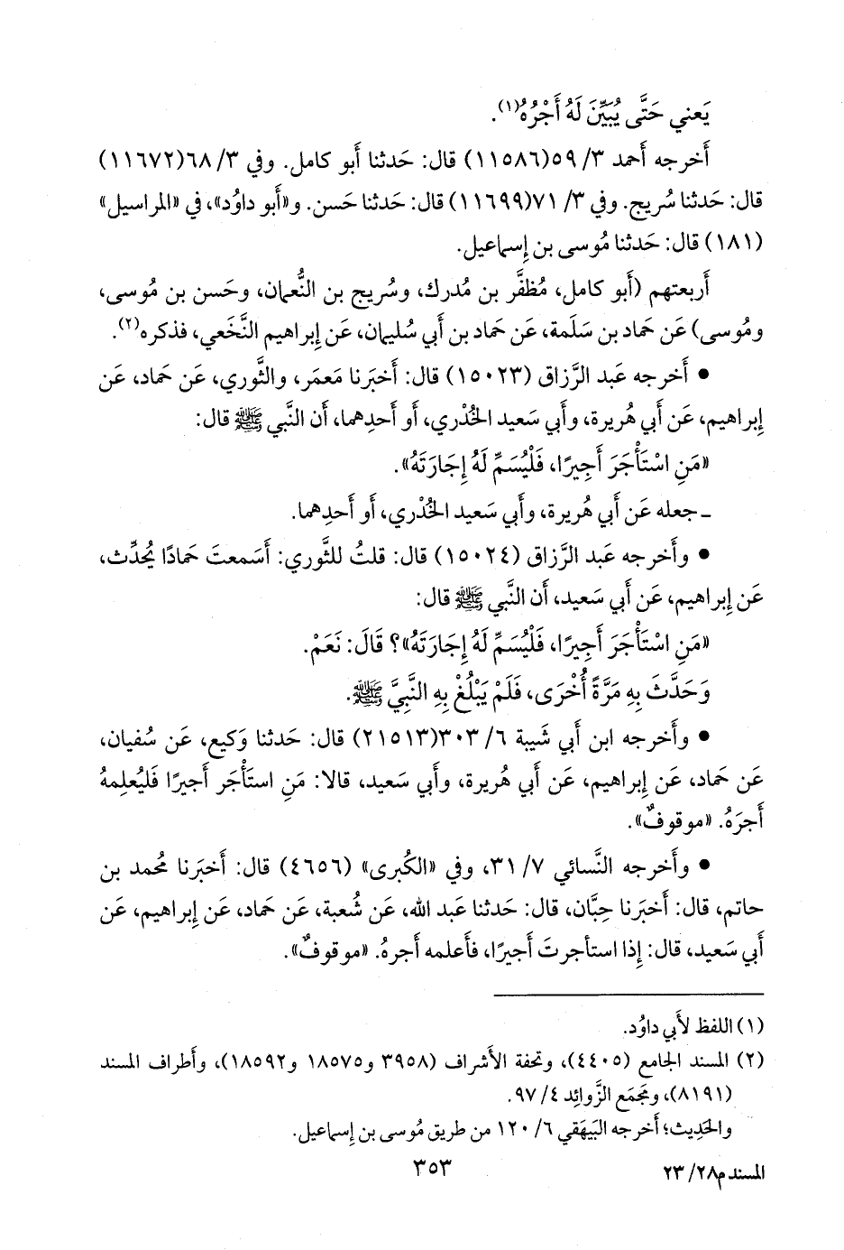 • وأخرجه ابن أبي شيبة (٢١٥١٣) قال: حدثنا وكيع، عن سفيان، عن حماد، عن إبراهيم، عن أبي هريرة، وأبي سعيد، قالا: من استأجر أجيرا فليعلمه أجره. «موقوف».