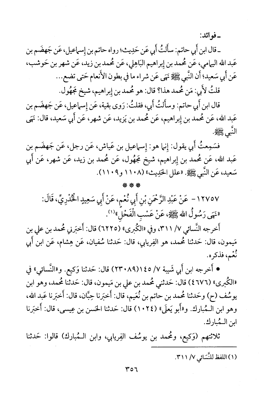 قال ابن أبي حاتم: وسألت أبي، فقلت: روى بقية، عن إسماعيل، عن جهضم بن عبد الله، عن محمد بن إبراهيم، عن محمد بن يزيد، عن شهر، عن أبي سعيد، قال: نهى النبي صَلى الله عَليه وسَلم.