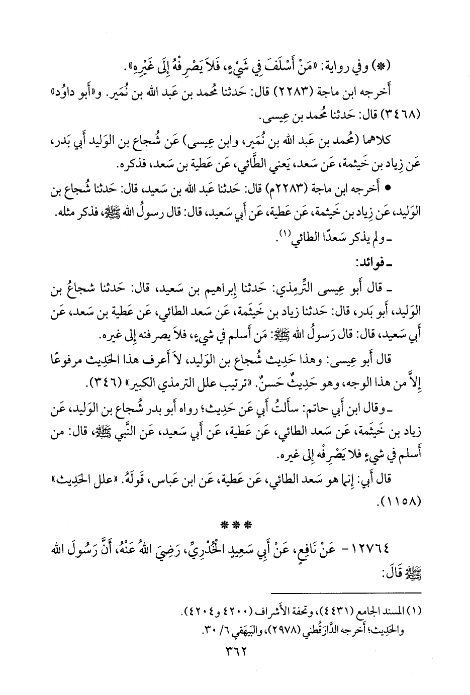 - وقال التِّرمِذي: حدثنا إبراهيم بن سعيد، قال: حدثنا شجاع بن الوليد، أَبو بدر، قال: حدثنا زياد بن خيثمة، عن سعد الطائي، عن عطية بن سعد، عن أبي سعيد، قال: قال رسول الله صَلى الله عَليه وسَلم: من أسلم في شيء، فلا يصرفنه إلى غيره.