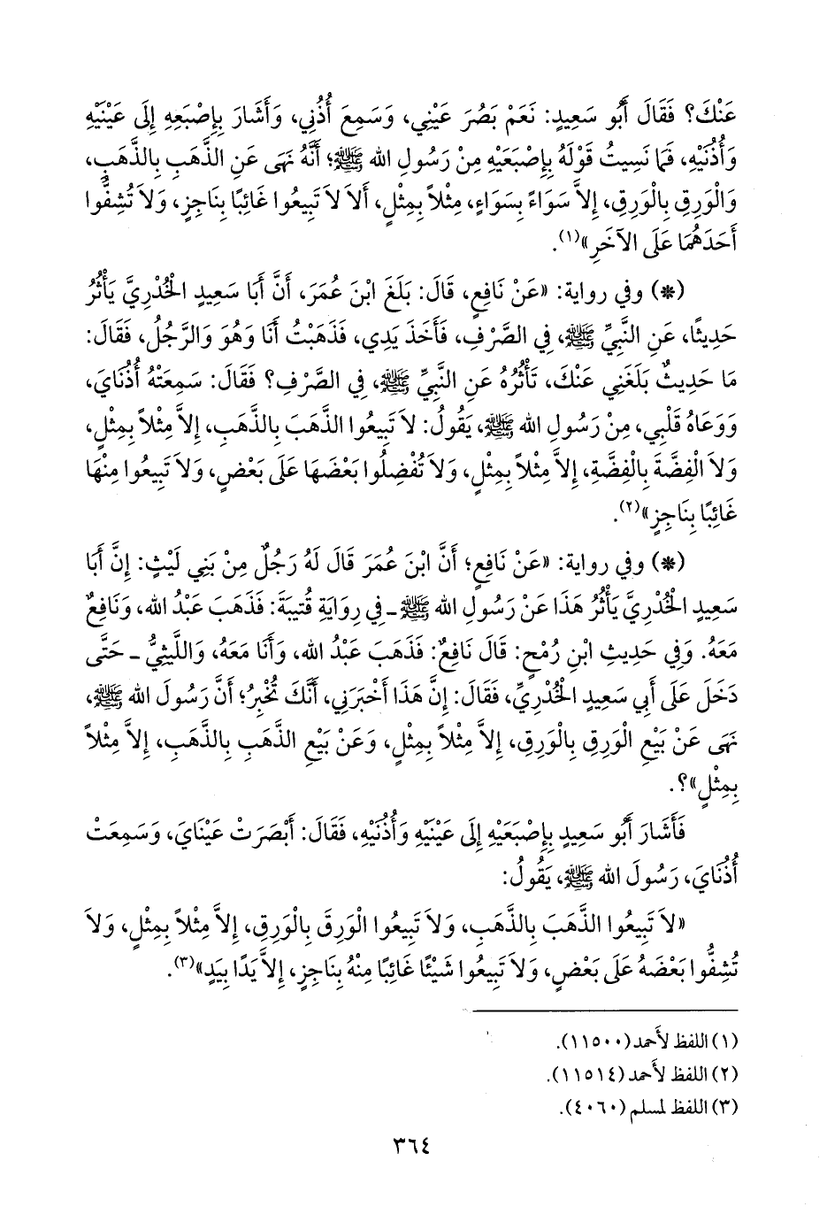 - وفي رواية: «عن نافع؛ أن ابن عمر قال له رجل من بني ليث: إن أبا سعيد الخُدْري يأثر هذا عن رسول الله صَلى الله عَليه وسَلم ـ في رواية قتيبة: فذهب عبد الله، ونافع معه. وفي حديث ابن رمح: قال نافع: فذهب عبد الله، وأنا معه، والليثي ـ حتى دخل على أبي سعيد الخُدْري، فقال: إن هذا أخبرني، أنك تخبر؛ أن رسول الله صَلى الله عَليه وسَلم نهى عن بيع الورق بالورق، إلا مثلا بمثل، وعن بيع الذهب بالذهب، إلا مثلا بمثل»؟.