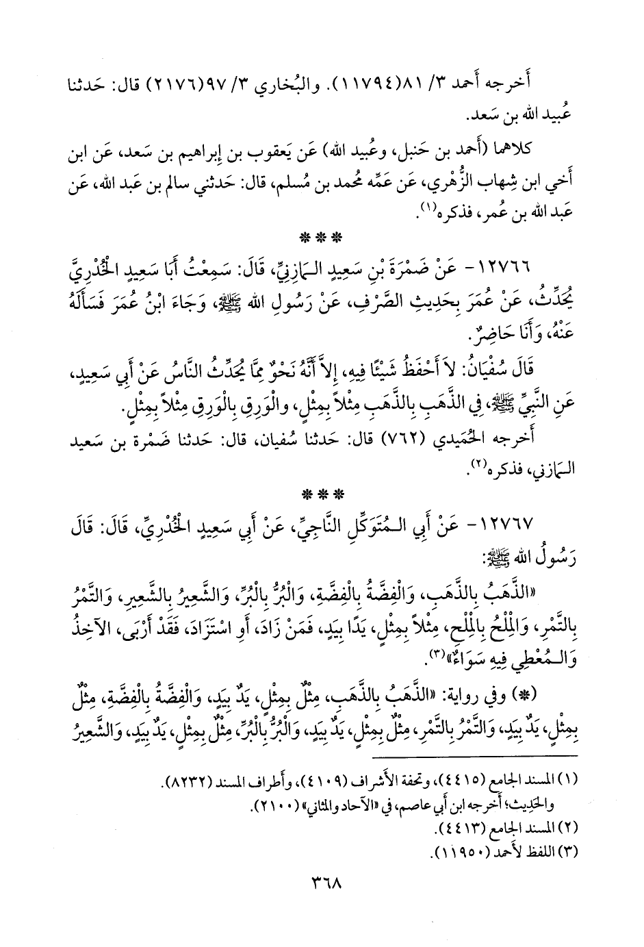 - وفي رواية: «الفضة بالفضة، والذهب بالذهب، سواء بسواء، مثلا بمثل، من زاد، أو استزاد، فقد أربى، والآخذ والمعطي سواء» (¬٣).