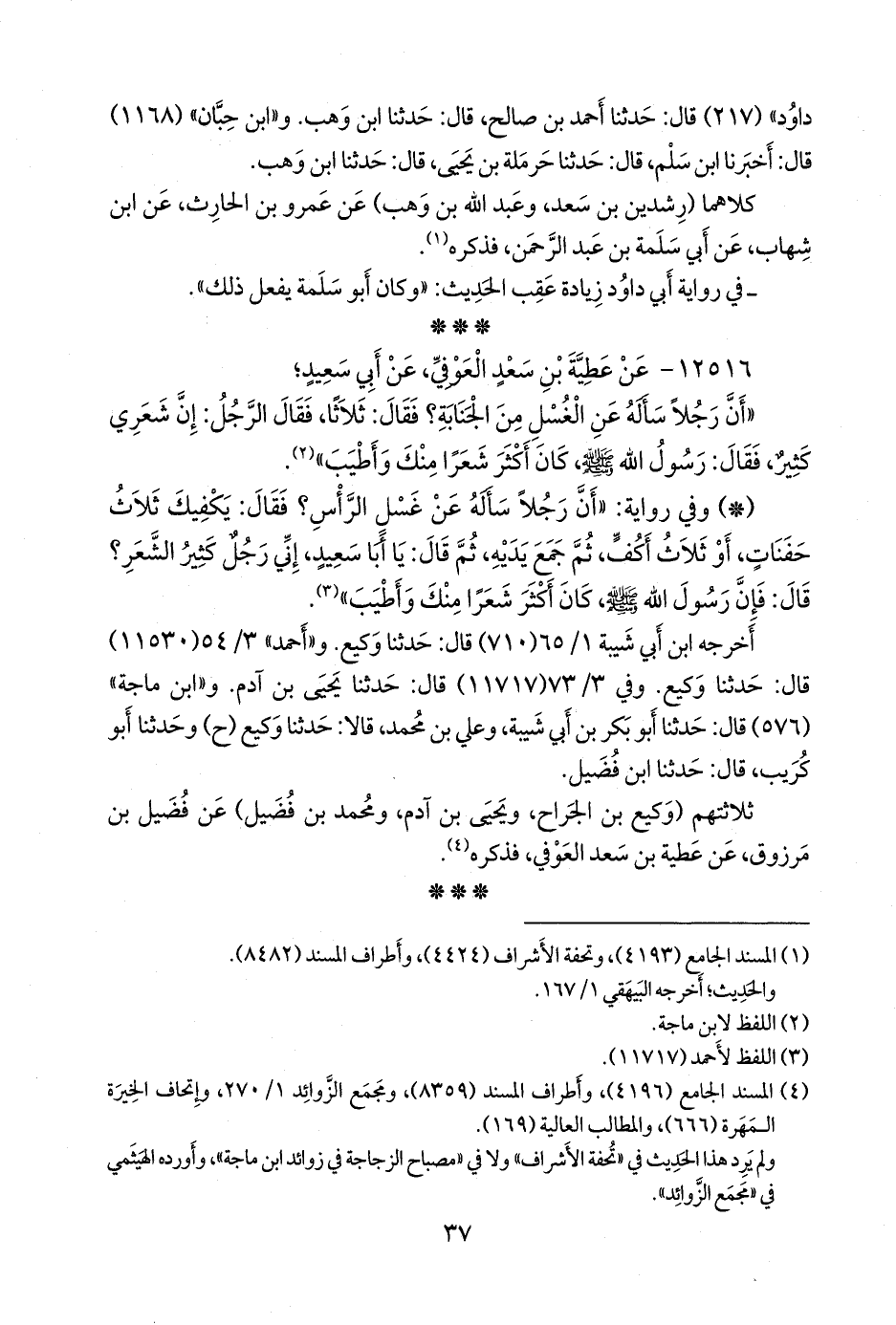 - وفي رواية: «أن رجلا سأله عن غسل الرأس؟ فقال: يكفيك ثلاث حفنات، أو ثلاث أكف، ثم جمع يديه، ثم قال: يا أبا سعيد، إني رجل كثير الشعر؟ قال: فإن رسول الله صَلى الله عَليه وسَلم كان أكثر شعرا منك وأطيب» (¬٢).