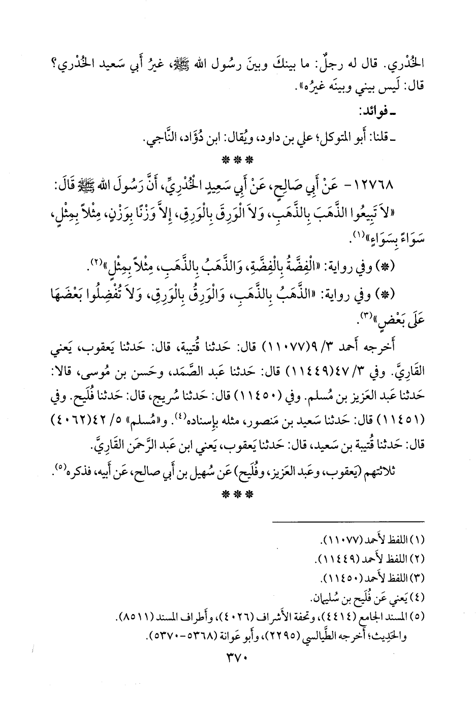 - وفي رواية: «الذهب بالذهب، والورق بالورق، ولا تفضلوا بعضها على بعض» (¬٣).