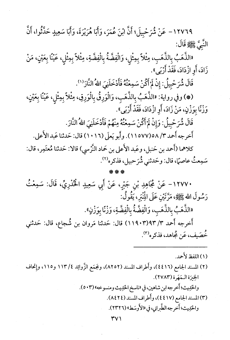 - وفي رواية: «الذهب بالذهب، والورق بالورق، مثلا بمثل، عينا بعين، وزنا بوزن، من زاد، أو ازداد، فقد أربى».