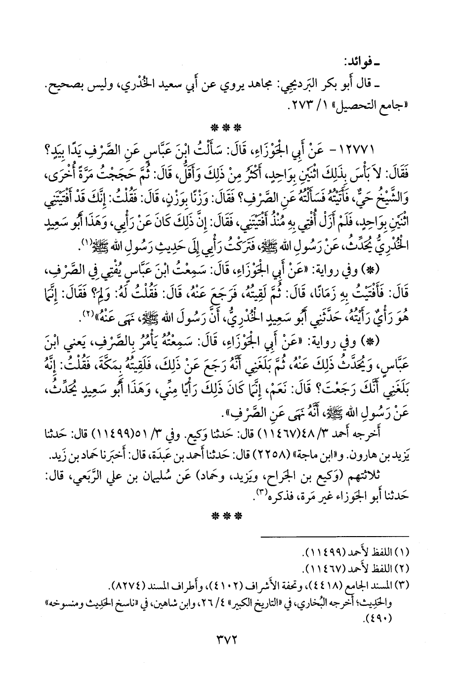 - وفي رواية: «عن أبي الجوزاء، قال: سمعته يأمر بالصرف، يعني ابن عباس، ويحدث ذلك عنه، ثم بلغني أنه رجع عن ذلك، فلقيته بمكة، فقلت: إنه بلغني أنك رجعت؟ قال: نعم، إنما كان ذلك رأيا مني، وهذا أَبو سعيد يحدث، عن رسول الله صَلى الله عَليه وسَلم أنه نهى عن الصرف».