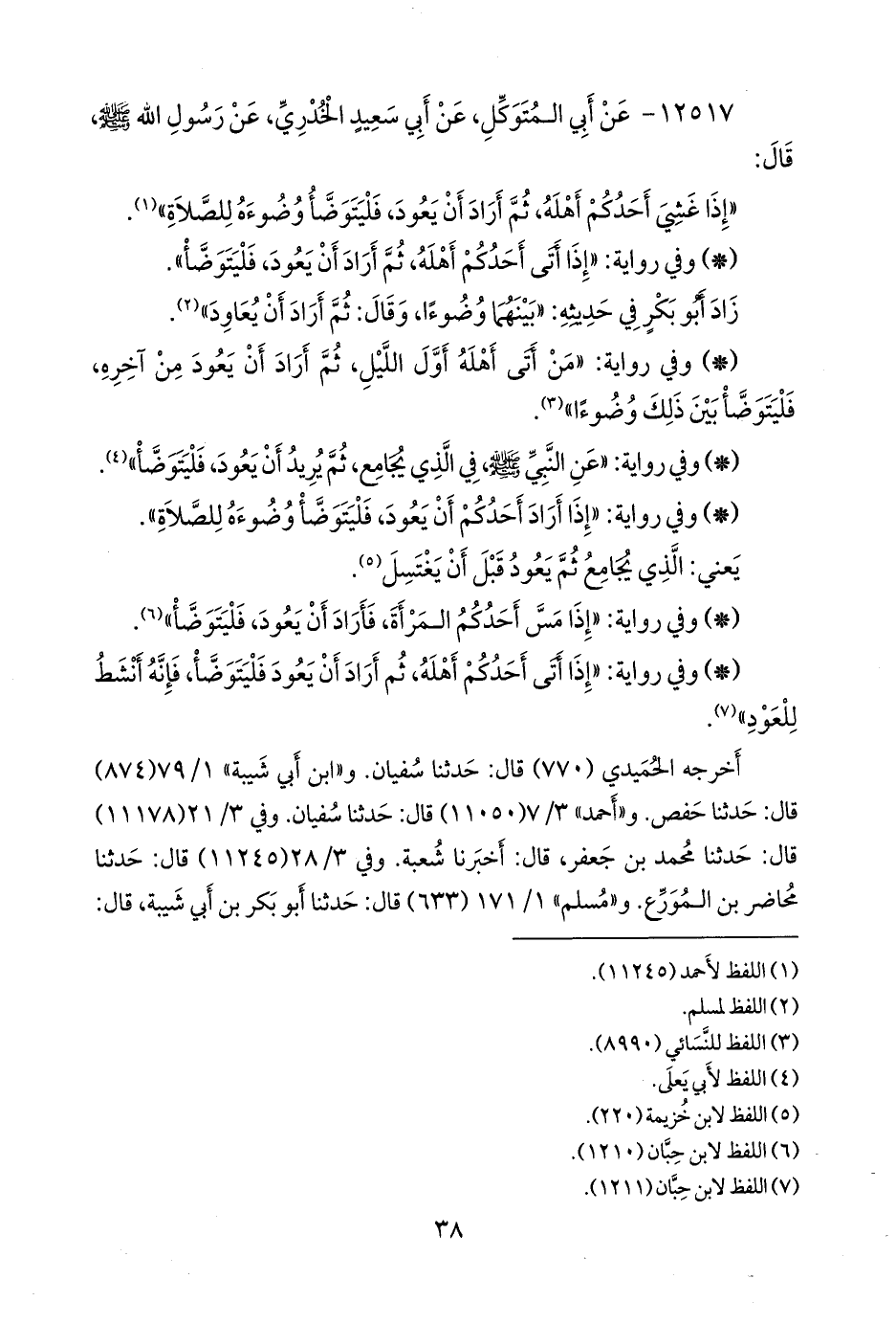 - وفي رواية: «عن النبي صَلى الله عَليه وسَلم في الذي يجامع، ثم يريد أن يعود، فليتوضأ» (¬٤).