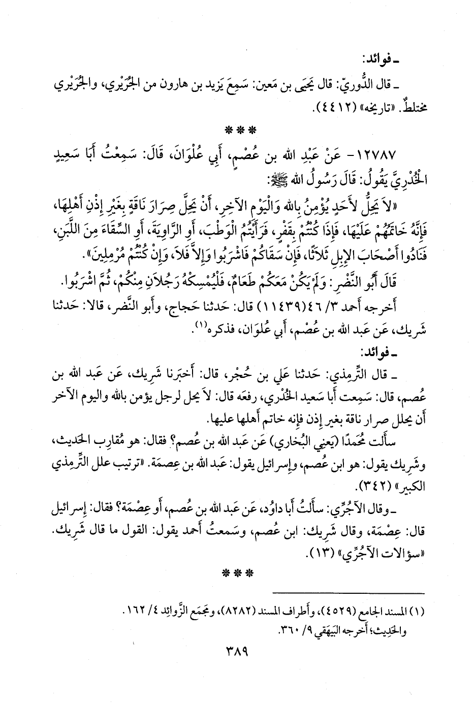 - قال التِّرمِذي: حدثنا علي بن حُجْر، قال: أخبرنا شريك، عن عبد الله بن عُصْم، قال: سمعت أبا سعيد الخُدْري، رفعه قال: لا يحل لرجل يؤمن بالله واليوم الآخر أن يحلل صرار ناقة بغير إذن فإنه خاتم أهلها عليها.