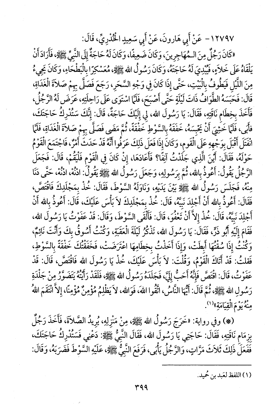 «كان رجل من المهاجرين، وكان ضعيفا، وكان له حاجة إلى النبي صَلى الله عَليه وسَلم فأراد أن يلقاه على خلاء، فيبدي له حاجته، وكان رسول الله صَلى الله عَليه وسَلم معسكرا بالبطحاء، وكان يجيء من الليل فيطوف بالبيت، حتى إذا كان في وجه السحر، رجع فصلى بهم صلاة الغداة، قال: فحبسه الطواف ذات ليلة حتى أصبح، فلما استوى على راحلته، عرض له الرجل، فأخذ بخطام ناقته، فقال: يا رسول الله، لي إليك حاجة، قال: إنك ستدرك حاجتك، فأبى، فلما خشي أن يحبسه، خفقه بالسوط خفقة، ثم مضى فصلى بهم صلاة الغداة، فلما انفتل أقبل بوجهه على القوم، وكان إذا فعل ذلك عرفوا أنه قد حدث أمر، فاجتمع القوم حوله، فقال: أين الذي جلدت آنفا؟ فأعادها، إن كان في القوم فليقم، قال: فجعل الرجل يقول: أعوذ بالله، ثم برسوله، وجعل رسول الله صَلى الله عَليه وسَلم يقول: ادنه، ادنه، حتى دنا منه، فجلس رسول الله صَلى الله عَليه وسَلم بين يديه، وناوله السوط، فقال: خذ بمجلدك فاقتص، فقال: أعوذ بالله أن أجلد نبيه، قال: خذ بمجلدك لا بأس عليك، قال: أعوذ بالله أن أجلد نبيه، قال: خذ إلا أن تعفو، قال: فألقى السوط، وقال: قد عفوت يا رسول الله، فقام إليه أَبو ذر، فقال: يا رسول الله، تذكر ليلة العقبة، وكنت أسوق بك وأنت نائم، وكنت إذا سقتها أبطت، وإذا أخذت بخطامها اعترضت، فخفقتك خفقة بالسوط، فقلت: قد أتاك القوم، وقلت: لا بأس عليك، خذ يا رسول الله فاقتص، قال: قد عفوت، قال: اقتص فإنه أحب إلي، فجلده رسول الله صَلى الله عَليه وسَلم فلقد رأيته يتضور من جلدة رسول الله صَلى الله عَليه وسَلم ثم قال: أيها الناس، اتقوا الله، فوالله، لا يظلم مؤمن مؤمنا، إلا انتقم الله منه يوم القيامة» (¬١).