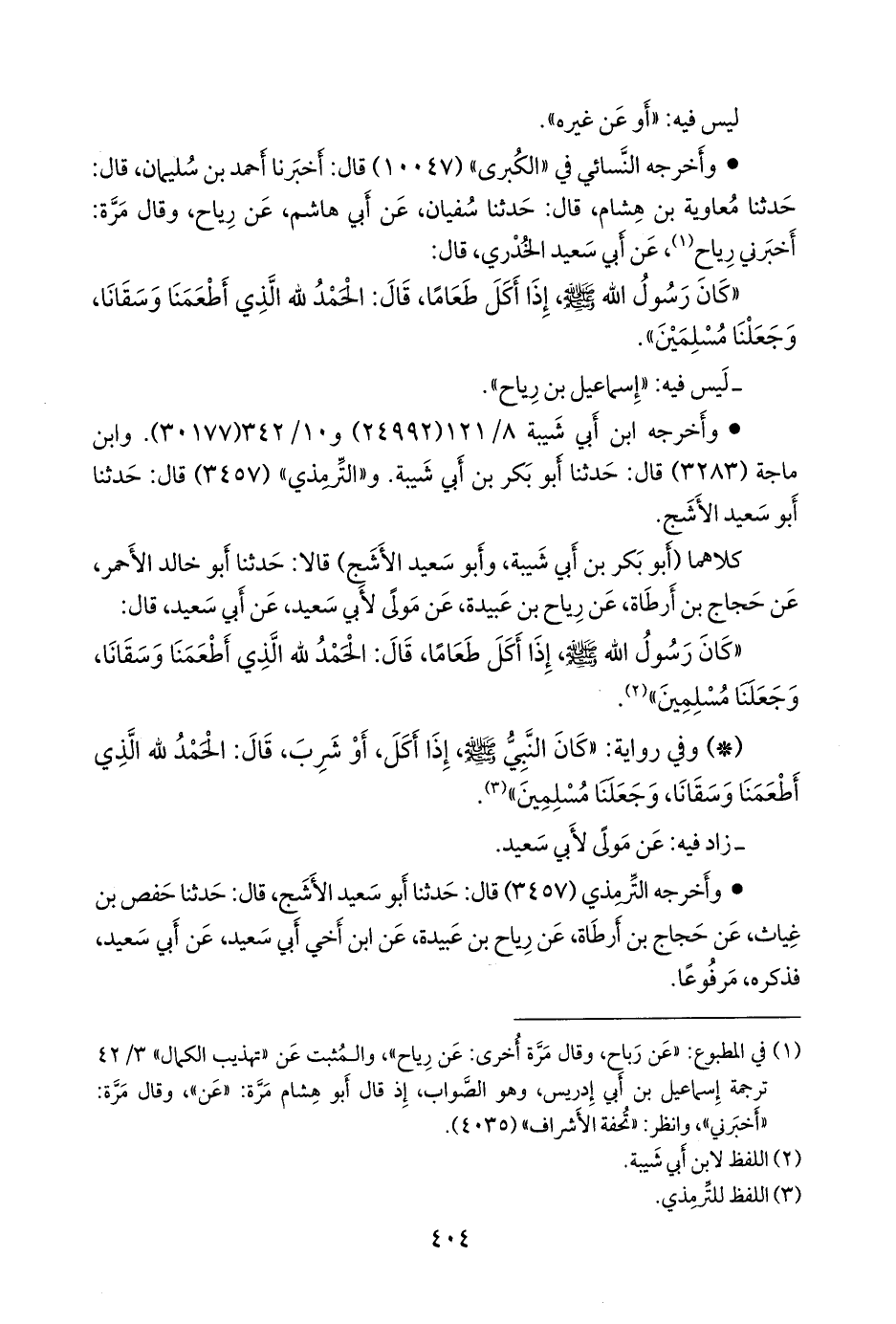 • وأخرجه النَّسَائي في «الكبرى» (١٠٠٤٩) قال: أخبرني زكريا بن يحيى، قال: حدثنا عبد الله بن مطيع، قال: حدثنا هُشيم، عن حصين، عن إسماعيل بن إدريس، عن أبي سعيد الخُدْري؛ أنه كان يقول، إذا طعم وشرب: الحمد لله الذي أطعمنا وسقانا، وجعلنا مسلمين. «موقوف» (¬٢).