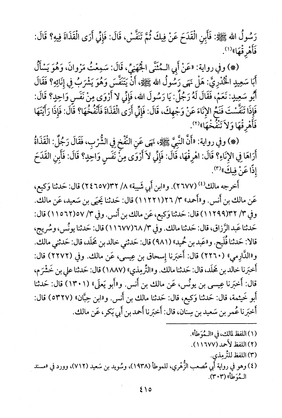وفي ٣/ ٣٢ (١١٢٩٩) قال: حدثنا وكيع، عن مالك بن أنس. وفي ٣/ ٥٧ (١١٥٦٢) قال: حدثنا عبد الرزاق، قال: حدثنا مالك. وفي ٣/ ٦٨ (١١٦٧٧) قال: حدثنا يونس، وسريج، قالا: حدثنا فليح. و «عَبد بن حُميد» (٩٨١) قال: حدثني خالد بن مخلد، قال: حدثني مالك. و «الدَّارِمي» (٢٢٦٠) قال: أخبرنا إسحاق بن عيسى، عن مالك. وفي (٢٢٧٢) قال: أخبرنا خالد بن مخلد، قال: حدثنا مالك. و «التِّرمِذي» (١٨٨٧) قال: حدثنا علي بن خَشرَم، قال: أخبرنا عيسى بن يونس، عن مالك بن أنس. و «أَبو يَعلى» (١٣٠١) قال: حدثنا أَبو خيثمة، قال: حدثنا وكيع، قال: حدثنا مالك بن أنس (¬١). و «ابن حِبَّان» (٥٣٢٧) قال: أخبرنا عمر بن سعيد بن سنان، قال: أخبرنا أحمد بن أَبي بكر، عن مالك.
