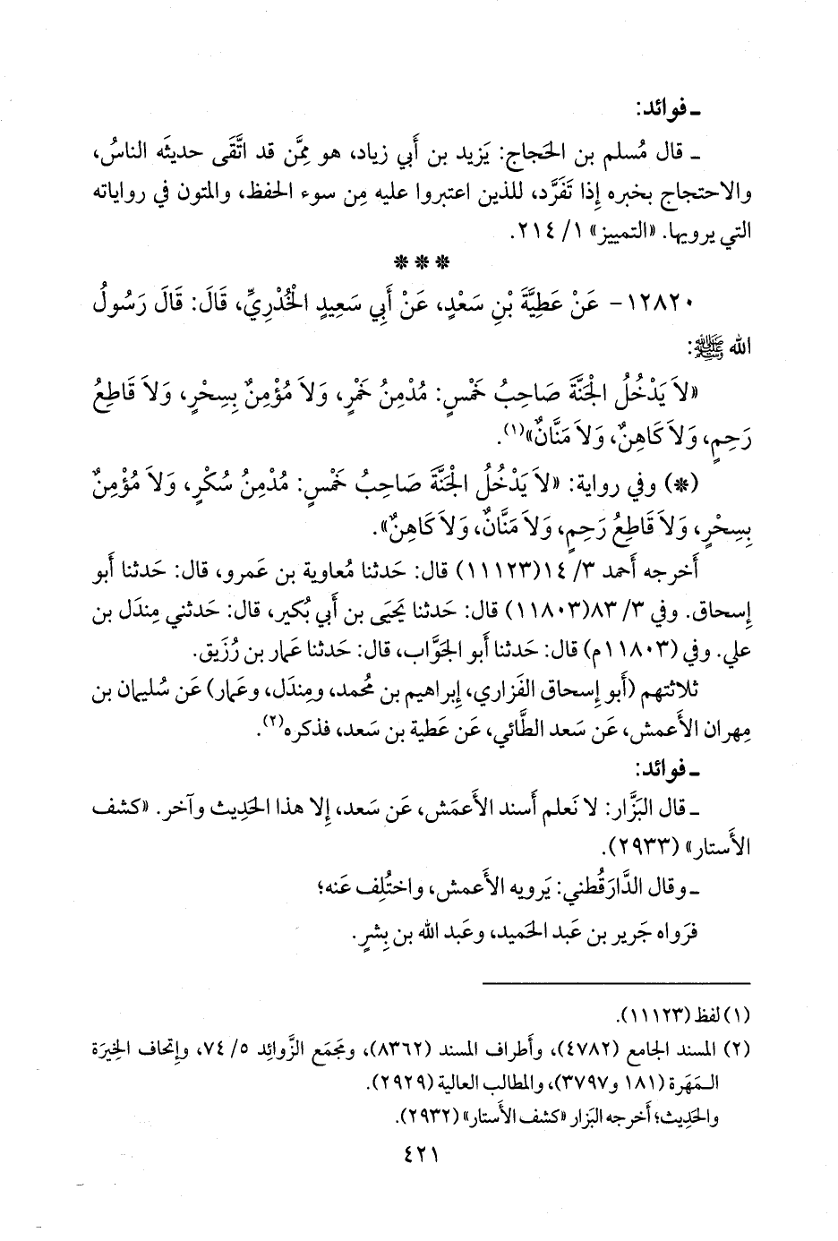 - وفي رواية: «لا يدخل الجنة صاحب خمس: مدمن سكر، ولا مؤمن بسحر، ولا قاطع رحم، ولا منان، ولا كاهن».