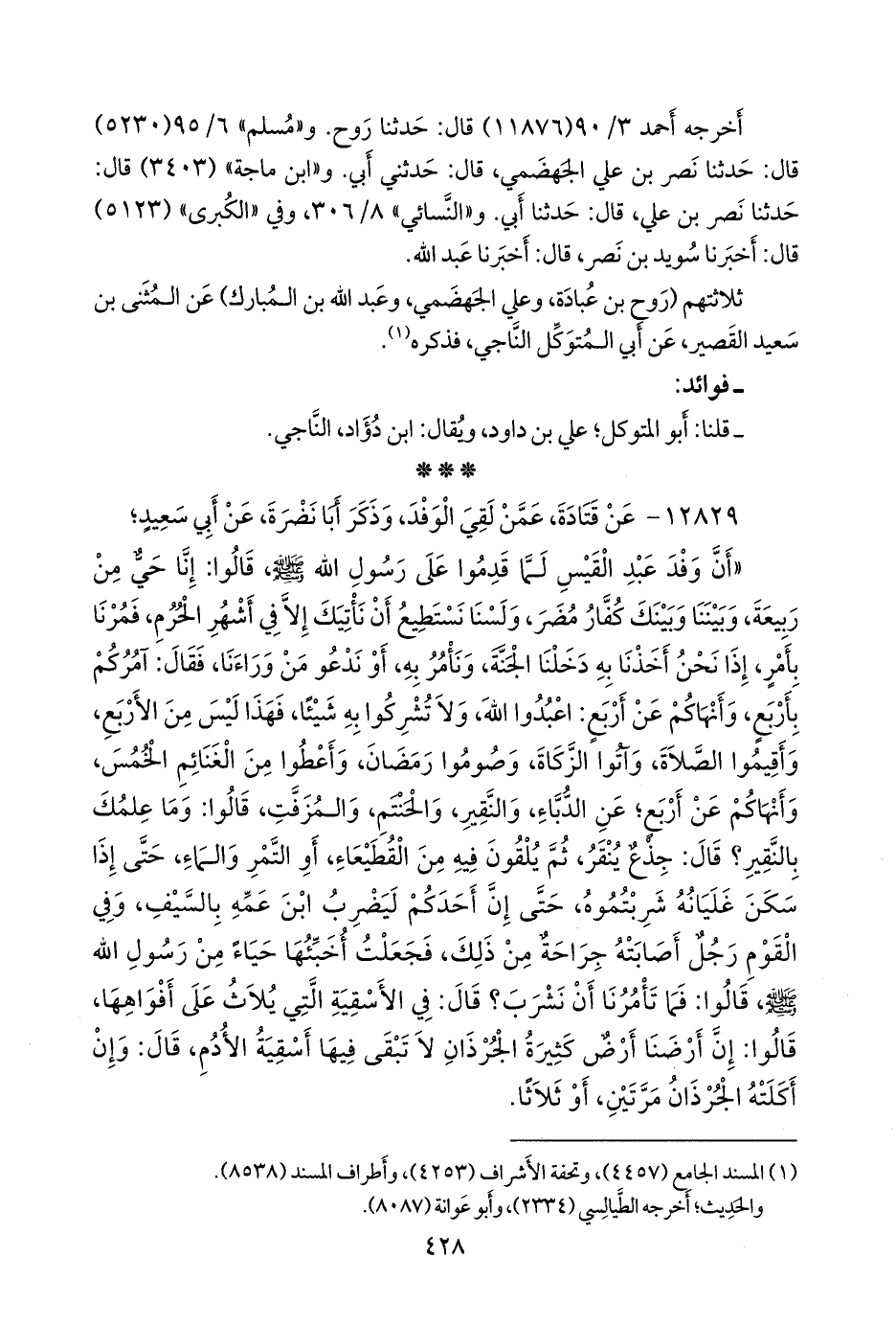 «أن وفد عبد القيس لما قدموا على رسول الله صَلى الله عَليه وسَلم قالوا: إنا حي من ربيعة، وبيننا وبينك كفار مضر، ولسنا نستطيع أن نأتيك إلا في أشهر الحرم، فمرنا بأمر، إذا نحن أخذنا به دخلنا الجنة، ونأمر به، أو ندعو من وراءنا، فقال: آمركم بأربع، وأنهاكم عن أربع: اعبدوا الله، ولا تشركوا به شيئا، فهذا ليس من الأربع، وأقيموا الصلاة، وآتوا الزكاة، وصوموا رمضان، وأعطوا من الغنائم الخمس، وأنهاكم عن أربع؛ عن الدُّبَّاء، والنقير، والحنتم، والمزفت، قالوا: وما علمك بالنقير؟ قال: جذع ينقر، ثم يلقون فيه من القطيعاء، أو التمر والماء، حتى إذا سكن غليانه شربتموه، حتى إن أحدكم ليضرب ابن عمه بالسيف، وفي القوم رجل أصابته جراحة من ذلك، فجعلت أَخْبؤُها حياء من رسول الله صَلى الله عَليه وسَلم قالوا: فما تأمرنا أن نشرب؟ قال: في الأسقية التي يلاث على أفواهها، قالوا: إن أرضنا أرض كثيرة الجِرذان لا تبقى فيها أسقية الأدم، قال: وإن أكلته الجِرذان مرتين، أو ثلاثا.