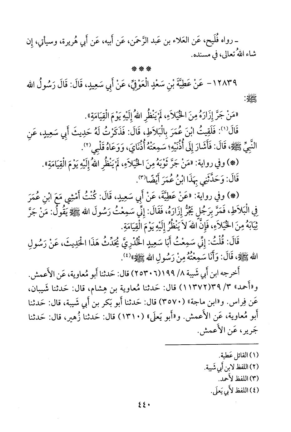 - وفي رواية: «عن عطية، عن أبي سعيد، قال: كنت أمشي مع ابن عمر في البلاط، فمر برجل يجر إزاره، فقال: إني سمعت رسول الله صَلى الله عَليه وسَلم يقول: من جر ثيابه من الخيلاء، فإن الله لا ينظر إليه يوم القيامة.