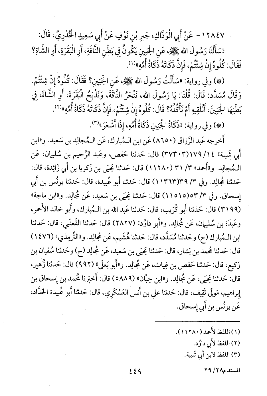 وفي ٣/ ٥٣ (١١٥١٥) قال: حدثنا يحيى بن سعيد، عن مجالد. و «ابن ماجة» (٣١٩٩) قال: حدثنا أَبو كُريب، قال: حدثنا عبد الله بن المبارك، وأَبو خالد الأحمر، وعَبدة بن سليمان، عن مجالد. و «أَبو داود» (٢٨٢٧) قال: حدثنا القَعنَبي، قال: حدثنا ابن المبارك (ح) وحدثنا مُسدد، قال: حدثنا هُشيم، عن مجالد. و «التِّرمِذي» (١٤٧٦) قال: حدثنا محمد بن بشار، قال: حدثنا يحيى بن سعيد، عن مجالد (ح) وحدثنا سفيان بن وكيع، قال: حدثنا حفص بن غياث، عن مجالد. و «أَبو يَعلى» (٩٩٢) قال: حدثنا زهير، قال: حدثنا يحيى، عن مجالد. و «ابن حِبَّان» (٥٨٨٩) قال: أخبرنا محمد بن إسحاق بن إبراهيم مولى ثقيف، قال: حدثنا علي بن أَنس العسكري، قال: حدثنا أَبو عبيدة الحداد، عن يونس بن أبي إسحاق.