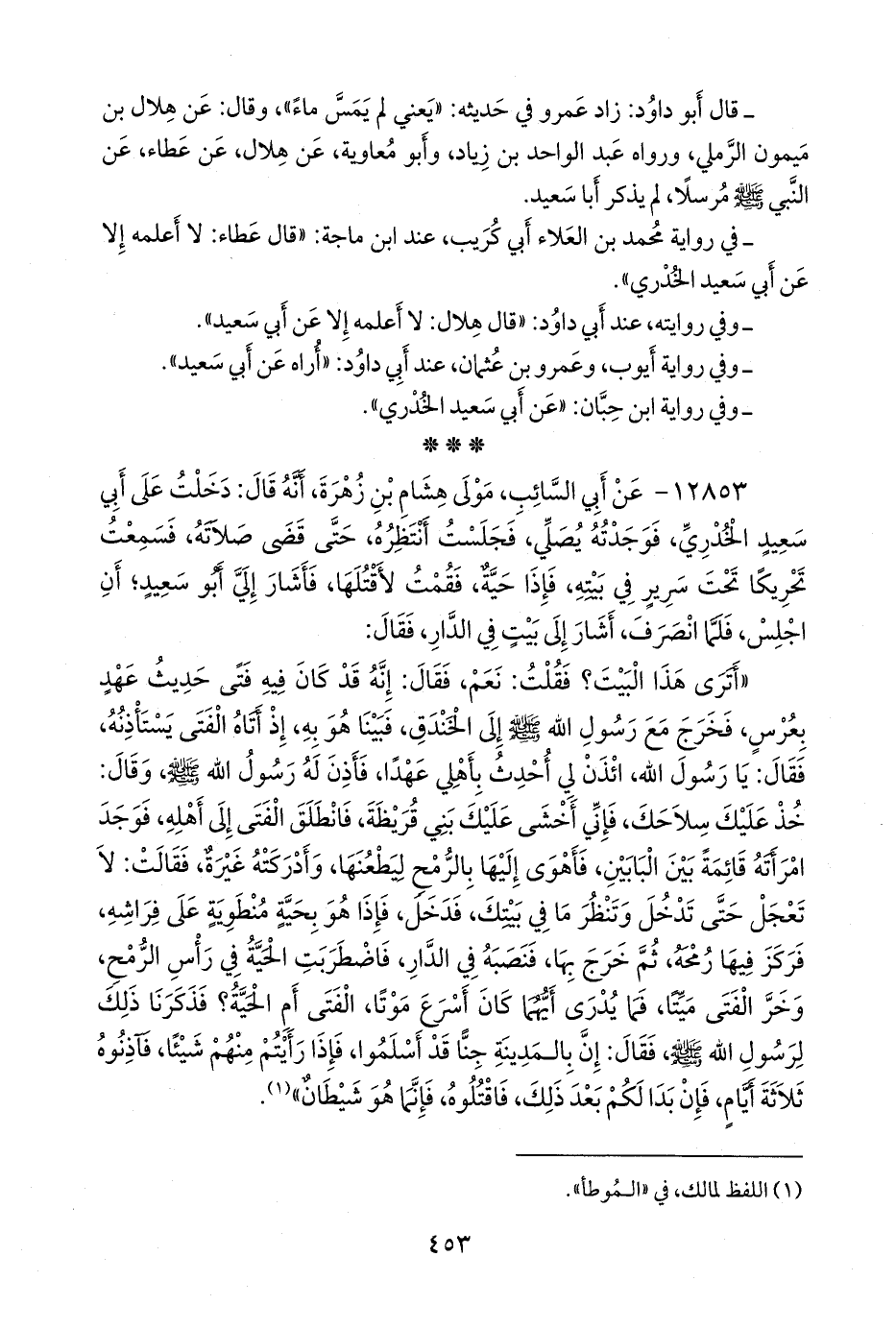١٢٨٥٣ - عن أبي السائب مولى هشام بن زهرة، أنه قال: دخلت على أبي سعيد الخُدْري، فوجدته يصلي، فجلست أنتظره، حتى قضى صلاته، فسمعت تحريكا تحت سرير في بيته، فإذا حية، فقمت لأقتلها، فأشار إلي أَبو سعيد؛ أن اجلس، فلما انصرف، أشار إلى بيت في الدار، فقال: