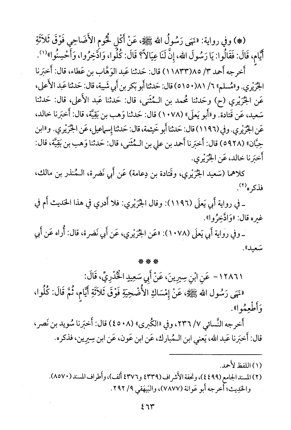 - في رواية أبي يَعلى (١١٩٦): وقال الجُريري: فلا أدري في هذا الحديث أم في غيره قال: «وادخروا».