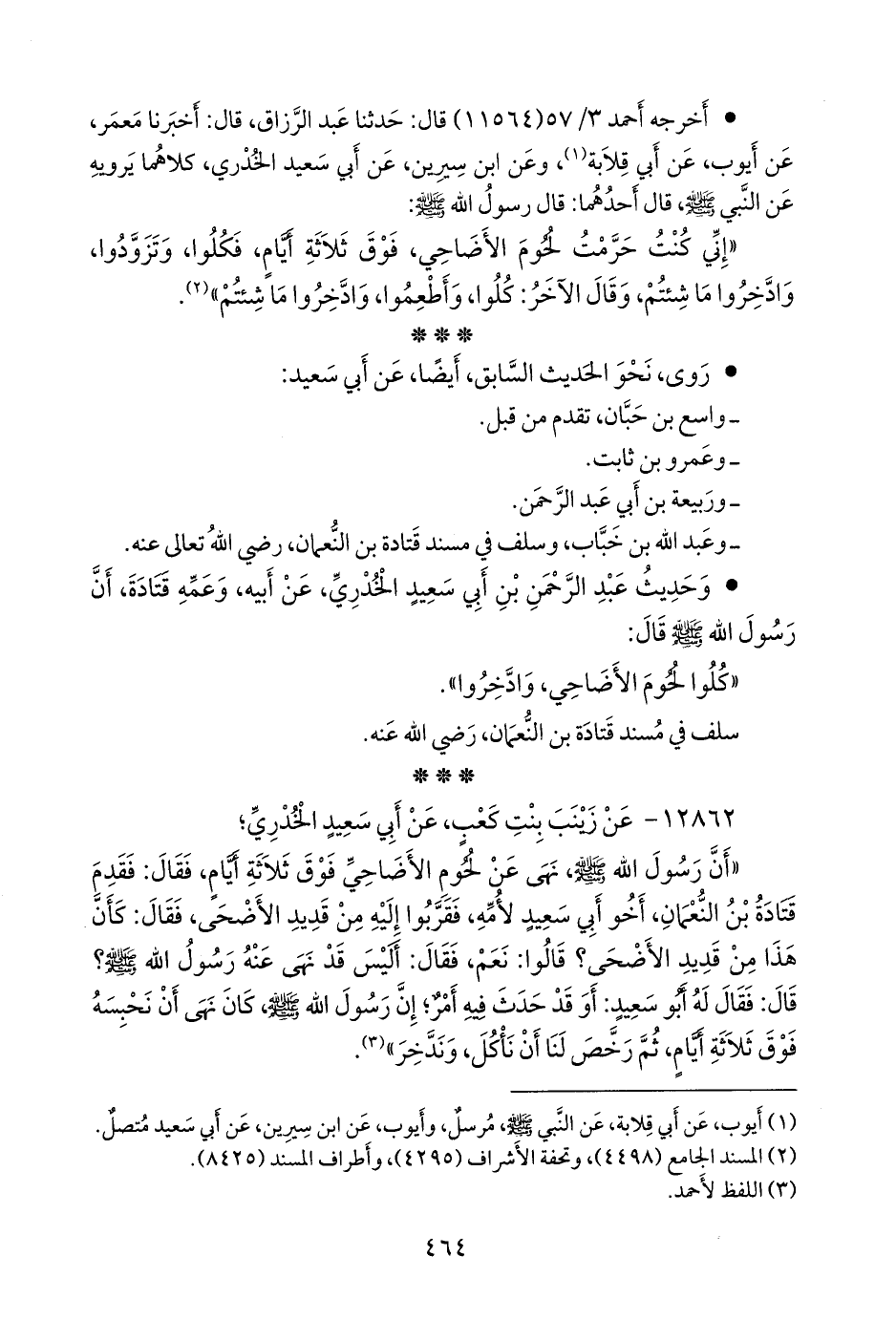 «أن رسول الله صَلى الله عَليه وسَلم نهى عن لحوم الأضاحي فوق ثلاثة أيام، فقال: فقدم قتادة بن النعمان، أخو أبي سعيد لأمه، فقربوا إليه من قديد الأضحى، فقال: كأن هذا من قديد الأضحى؟ قالوا: نعم، فقال: أليس قد نهى عنه رسول الله صَلى الله عَليه وسَلم؟ قال: فقال له أَبو سعيد: أو قد حدث فيه أمر؛ إن رسول الله صَلى الله عَليه وسَلم كان نهى أن نحبسه فوق ثلاثة أيام، ثم رخص لنا أن نأكل، وندخر» (¬١).