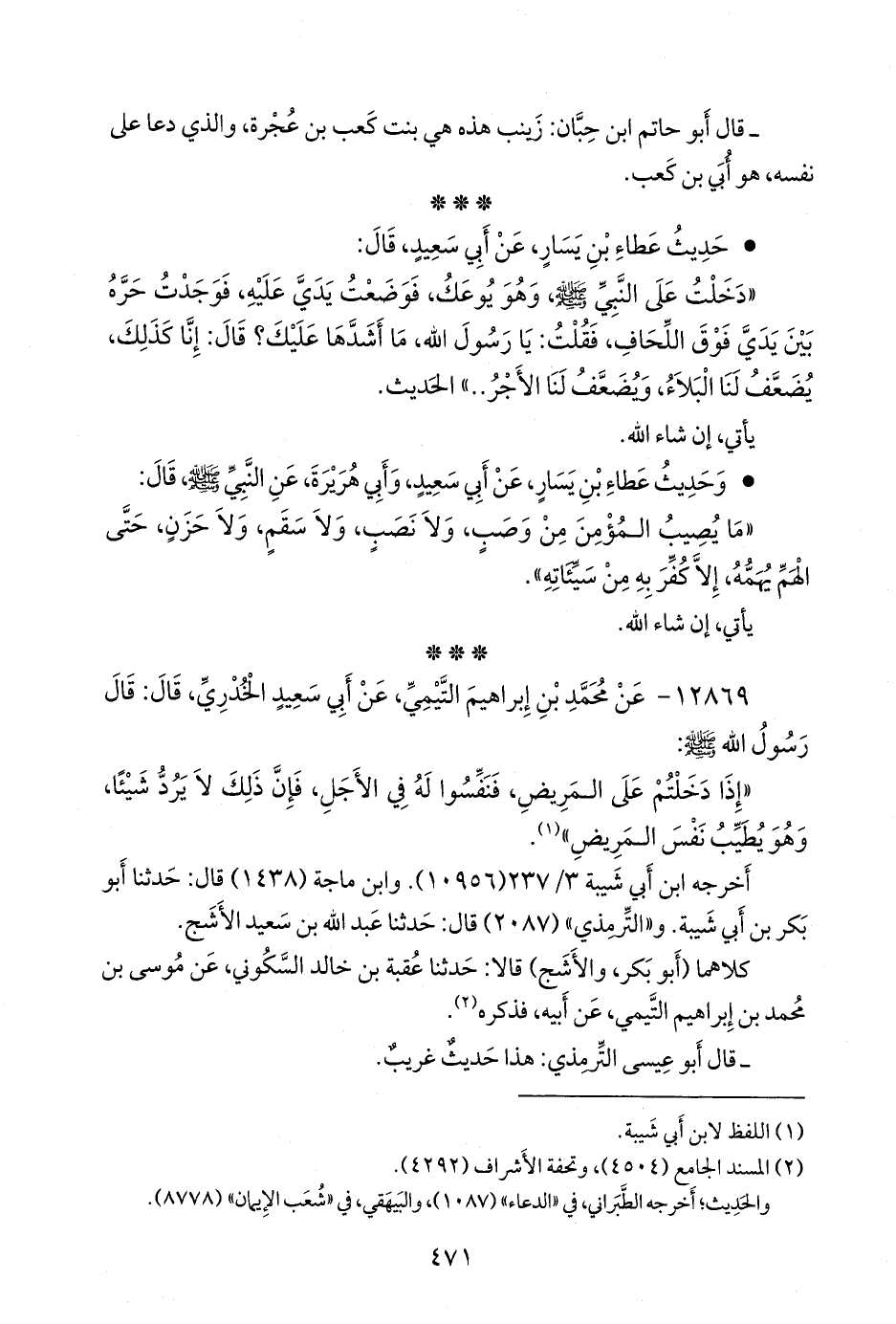 «إذا دخلتم على المريض، فنفسوا له في الأجل، فإن ذلك لا يرد شيئا، وهو يطيب نفس المريض» (¬١).