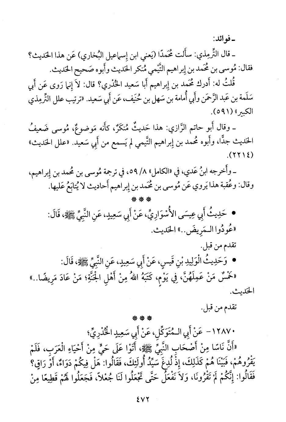 - قال التِّرمِذي: سألتُ محمدًا، يعني ابن إسماعيل البخاري، عن هذا الحديث؟ فقال: موسى بن محمد بن إبراهيم التيمي منكر الحديث وأَبوه صحيح الحديث.
