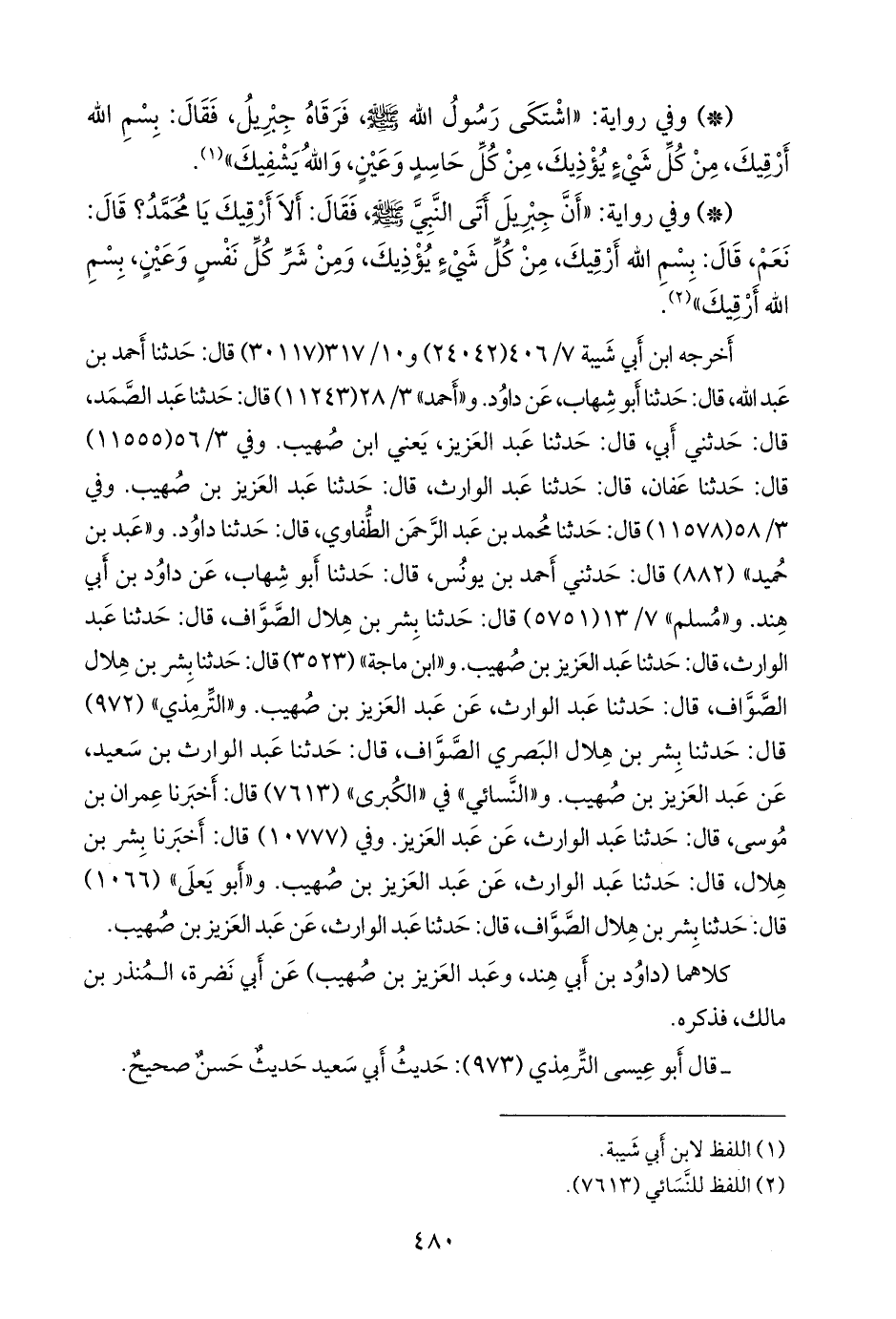 وفي ٣/ ٥٦ (١١٥٥٥) قال: حدثنا عفان، قال: حدثنا عبد الوارث، قال: حدثنا عبد العزيز بن صُهَيب. وفي ٣/ ٥٨ (١١٥٧٨) قال: حدثنا محمد بن عبد الرَّحمَن الطفاوي، قال: حدثنا داود. و «عَبد بن حُميد» (٨٨٢) قال: حدثني أحمد بن يونس، قال: حدثنا أَبو شهاب، عن داود بن أبي هند. و «مسلم» ٧/ ١٣ (٥٧٥١) قال: حدثنا بشر بن هلال الصواف، قال: حدثنا عبد الوارث، قال: حدثنا عبد العزيز بن صُهَيب. و «ابن ماجة» (٣٥٢٣) قال: حدثنا بشر بن هلال الصواف، قال: حدثنا عبد الوارث، عن عبد العزيز بن صُهَيب. و «التِّرمِذي» (٩٧٢) قال: حدثنا بشر بن هلال البصري الصواف، قال: حدثنا عبد الوارث بن سعيد، عن عبد العزيز بن صُهَيب. و «النَّسَائي» في «الكبرى» (٧٦١٣) قال: أخبرنا عمران بن موسى، قال: حدثنا عبد الوارث، عن عبد العزيز. وفي (١٠٧٧٧) قال: أخبرنا بشر بن هلال، قال: حدثنا عبد الوارث، عن عبد العزيز بن صُهَيب. و «أَبو يَعلى» (١٠٦٦) قال: حدثنا بشر بن هلال الصواف، قال: حدثنا عبد الوارث، عن عبد العزيز بن صُهَيب.