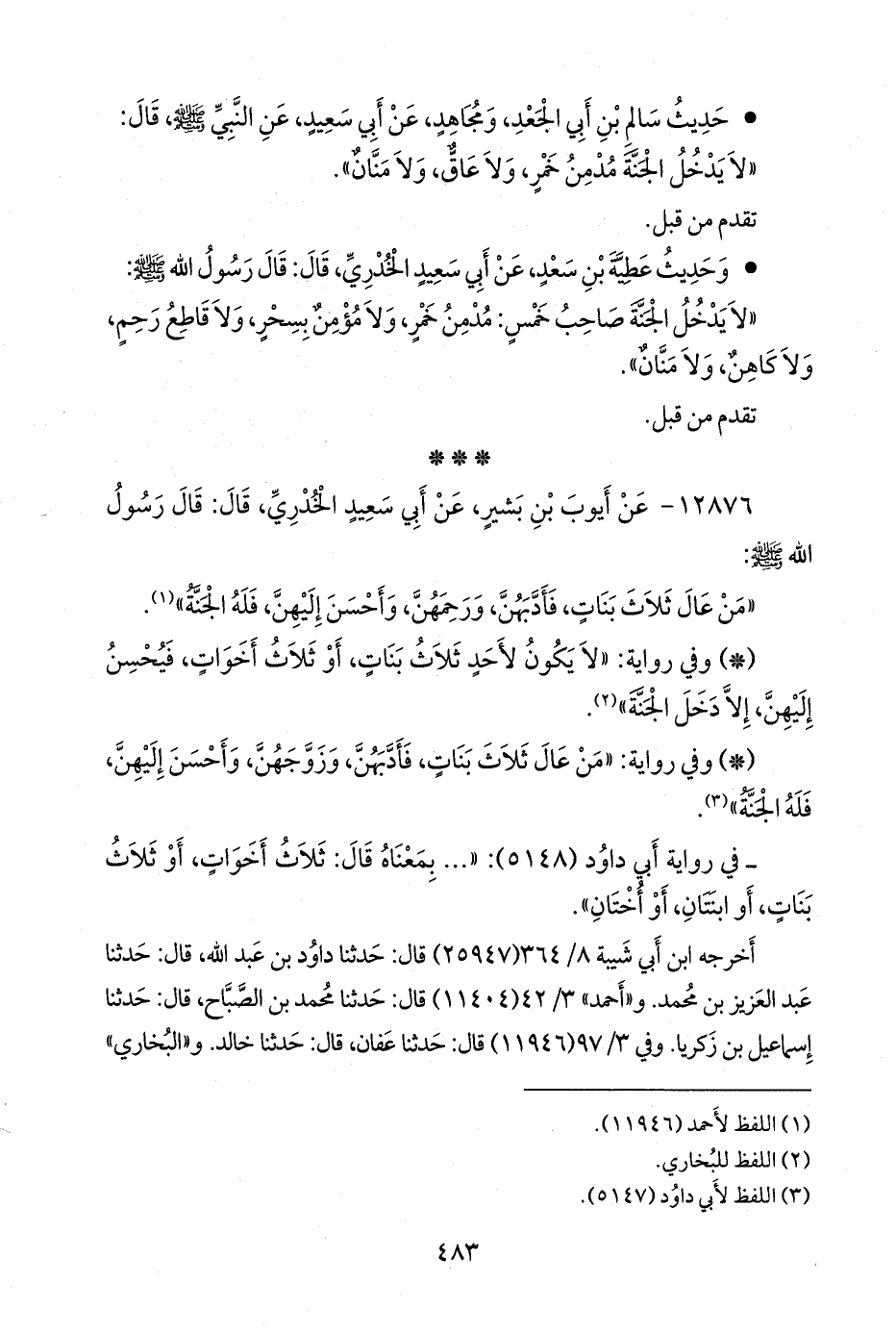- في رواية أبي داود (٥١٤٨): «بمعناه قال: ثلاث أخوات، أو ثلاث بنات، أو ابنتان، أو أختان».