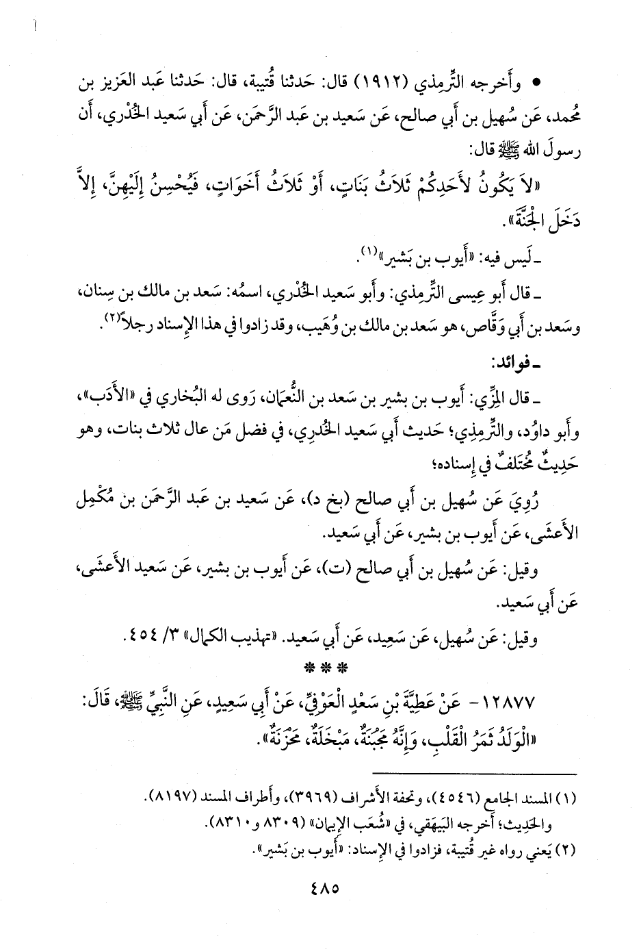 - وقال المِزِّي: أيوب بن بشير بن سعد بن النعمان، روى له البخاري في «الأدب»، وأَبو داود، والتِّرمِذي؛ حديث أبي سعيد الخُدْري، في فضل من عال ثلاث بنات، وهو حديث مختلف في إسناده؛