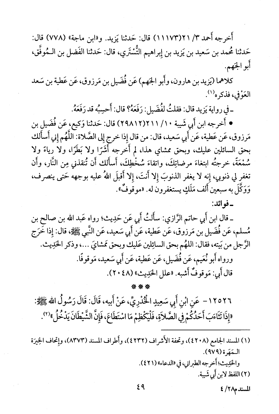 - وقال ابن أبي حاتم الرازي: سألتُ أبي عن حديثٍ؛ رواه عبد الله بن صالح بن مسلم، عن فضيل بن مرزوق، عن عطية، عن أبي سعيد، عن النبي صَلى الله عَليه وسَلم قال: إذا خرج الرجل من بيته، فقال: اللهم بحق السائلين عليك وبحق ممشاي ... ، وذكر الحديث.