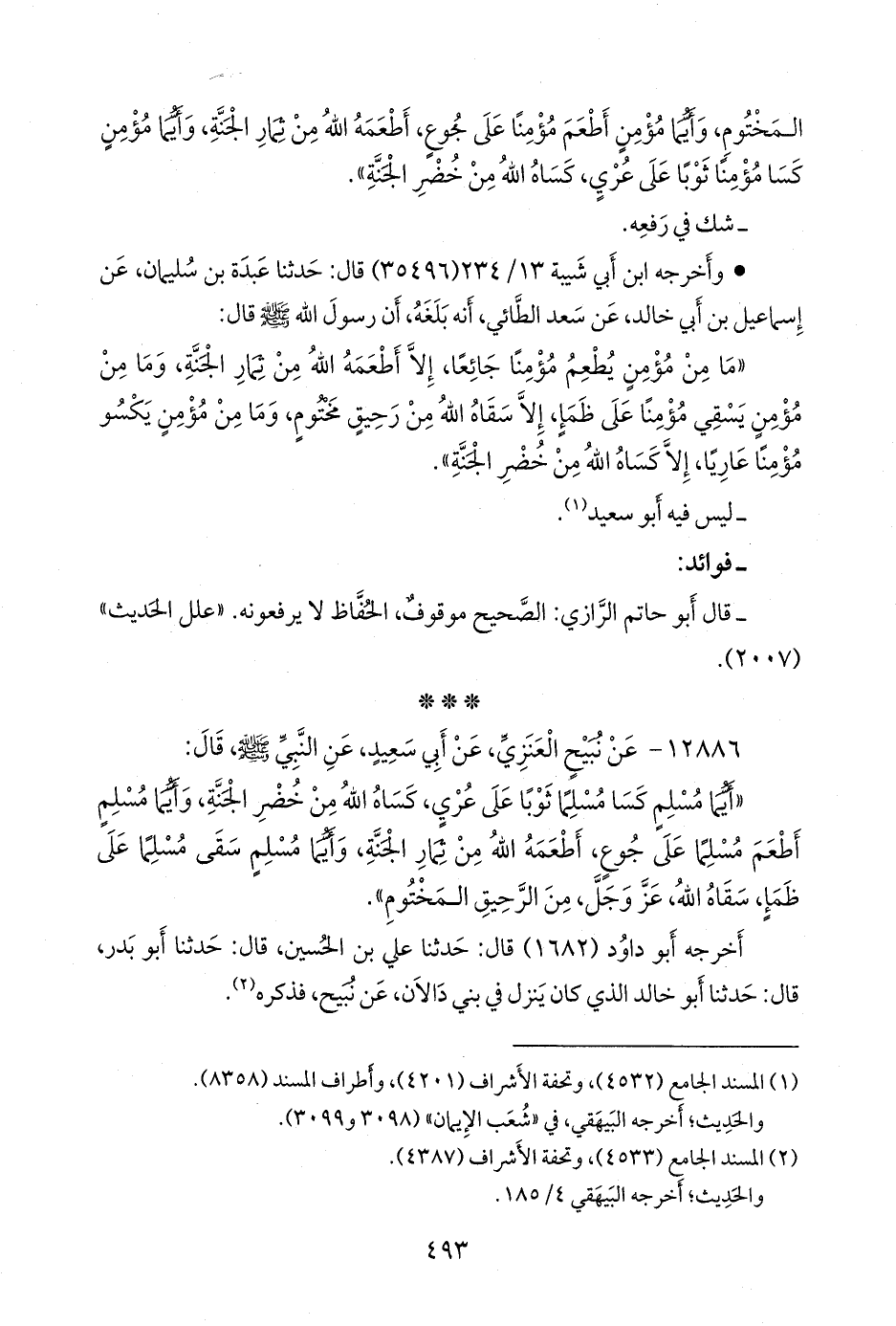 «أيما مسلم كسا مسلما ثوبا على عري، كساه الله من خضر الجنة، وأيما مسلم أطعم مسلما على جوع، أطعمه الله من ثمار الجنة، وأيما مسلم سقى مسلما على ظمإ، سقاه الله، عز وجل، من الرحيق المختوم».