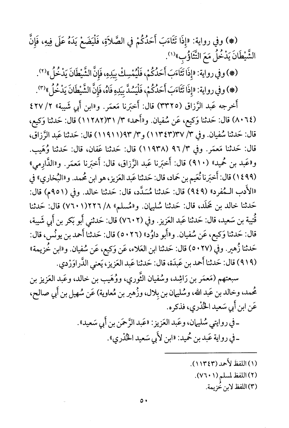 و «مسلم» ٨/ ٢٢٦ (٧٦٠١) قال: حدثنا قتيبة بن سعيد، قال: حدثنا عبد العزيز. وفي (٧٦٠٢) قال: حدثني أَبو بكر بن أبي شيبة، قال: حدثنا وكيع، عن سفيان. و «أَبو داود» (٥٠٢٦) قال: حدثنا أحمد بن يونس، قال: حدثنا زهير. وفي (٥٠٢٧) قال: حدثنا ابن العلاء، عن وكيع، عن سفيان. و «ابن خزيمة» (٩١٩) قال: حدثنا أحمد بن عَبدة، قال: حدثنا عبد العزيز، يعني الدراوَرْدي.