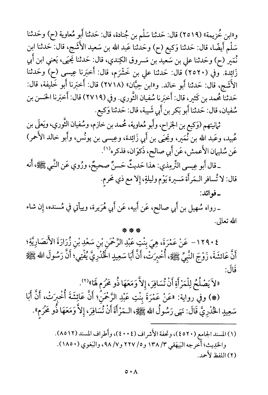 - وفي رواية: «عن عَمرَة بنت عبد الرَّحمَن؛ أن عائشة أخبرت، أن أبا سعيد الخُدْري قال: نهى رسول الله صَلى الله عَليه وسَلم المرأة أن تسافر، إلا ومعها ذو مَحْرَم».
