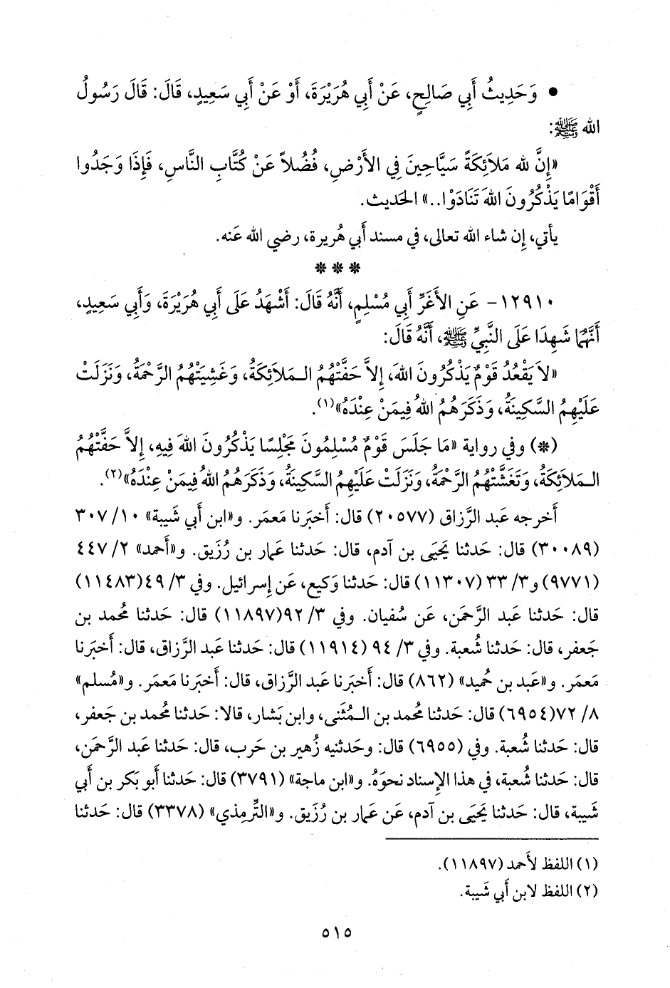 - وفي رواية: «ما جلس قوم مسلمون مجلسا يذكرون الله فيه، إلا حفتهم الملائكة، وتغشتهم الرحمة، ونزلت عليهم السكينة، وذكرهم الله فيمن عنده» (¬٢).