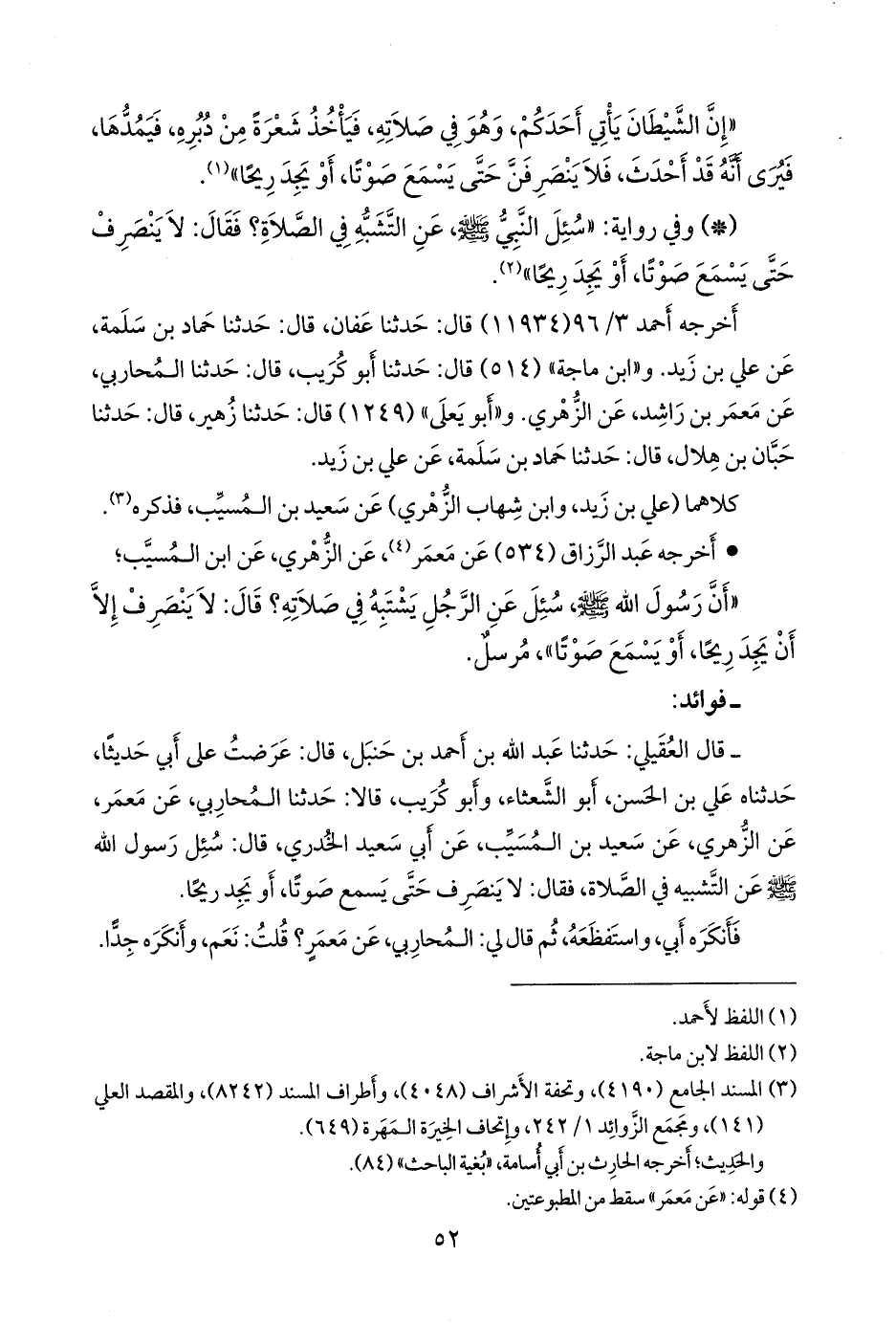 - قال العُقيلي: حدثنا عبد الله بن أَحمد بن حَنبل، قال: عَرَضتُ على أَبي حديثًا، حدثناه علي بن الحسن، أَبو الشعثاء، وأَبو كُريب، قالا: حدثنا المُحاربي، عن مَعمر، عن الزُّهْري، عن سعيد بن المُسَيب، عن أَبي سعيد الخُدري، قال: سُئل رسول الله صَلى الله عَليه وسَلم عن التَّشبيه في الصلاة، فقال: لا ينصرف حتى يسمع صوتًا، أَو يَجد ريحًا، فأَنكره أَبي، واستفظعه، ثم قال لي: المُحاربي، عن مَعمر؟ قلتُ: نعم، وأَنكره جدًّا.