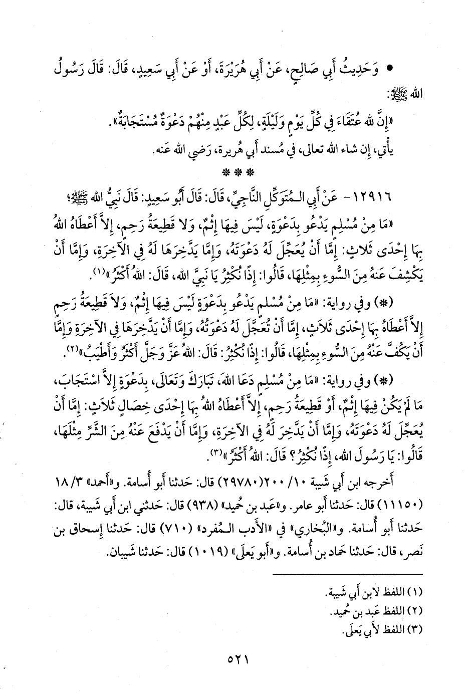 - وفي رواية: «ما من مسلم دعا الله، تبارك وتعالى، بدعوة إلا استجاب، ما لم يكن فيها إثم، أو قطيعة رحم، إلا أعطاه الله بها إحدى خصال ثلاث: إما أن يعجل له دعوته، وإما أن يدخر له في الآخرة، وإما أن يدفع عنه من الشر مثلها، قالوا: يا رسول الله، إذا نكثر؟ قال: الله أكثر» (¬٣).