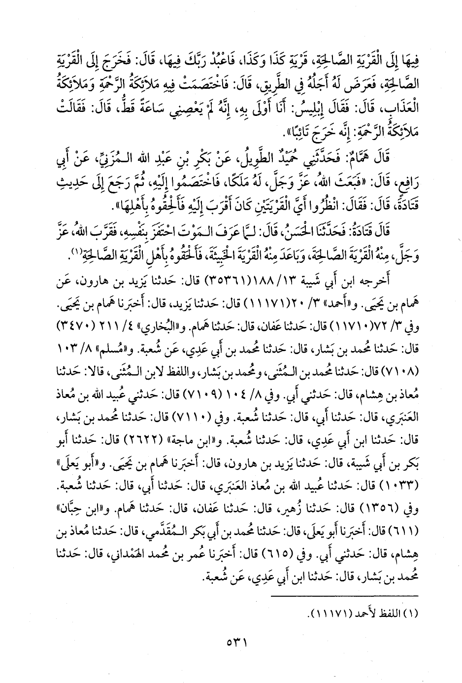 وفي ٣/ ٧٢ (١١٧١٠) قال: حدثنا عفان، قال: حدثنا همام. و «البخاري» ٤/ ١٧٤ (٣٤٧٠) قال: حدثنا محمد بن بشار، قال: حدثنا محمد بن أَبي عَدي، عن شعبة. و «مسلم» ٨/ ١٠٣ (٧١٠٨) قال: حدثنا محمد بن المثنى، ومحمد بن بشار، واللفظ لابن المثنى، قالا: حدثنا معاذ بن هشام، قال: حدثني أبي. وفي ٨/ ١٠٤ (٧١٠٩) قال: حدثني عُبيد الله بن معاذ العنبري، قال: حدثنا أبي، قال: حدثنا شعبة. وفي (٧١١٠) قال: حدثنا محمد بن بشار، قال: حدثنا ابن أَبي عَدي، قال: حدثنا شعبة. و «ابن ماجة» (٢٦٢٢) قال: حدثنا أَبو بكر بن أبي شيبة، قال: حدثنا يزيد بن هارون، قال: أخبرنا همام بن يحيى. و «أَبو يَعلى» (١٠٣٣) قال: حدثنا عُبيد الله بن معاذ العنبري، قال: حدثنا أبي، قال: حدثنا شعبة. وفي (١٣٥٦) قال: حدثنا زهير، قال: حدثنا عفان، قال: حدثنا همام. و «ابن حِبَّان» (٦١١) قال: أخبرنا أَبو يَعلى، قال: حدثنا محمد بن أَبي بكر المُقَدَّمي، قال: حدثنا معاذ بن هشام، قال: حدثني أبي. وفي (٦١٥) قال: أخبرنا عمر بن محمد الهمداني، قال: حدثنا محمد بن بشار، قال: حدثنا ابن أَبي عَدي، عن شعبة.