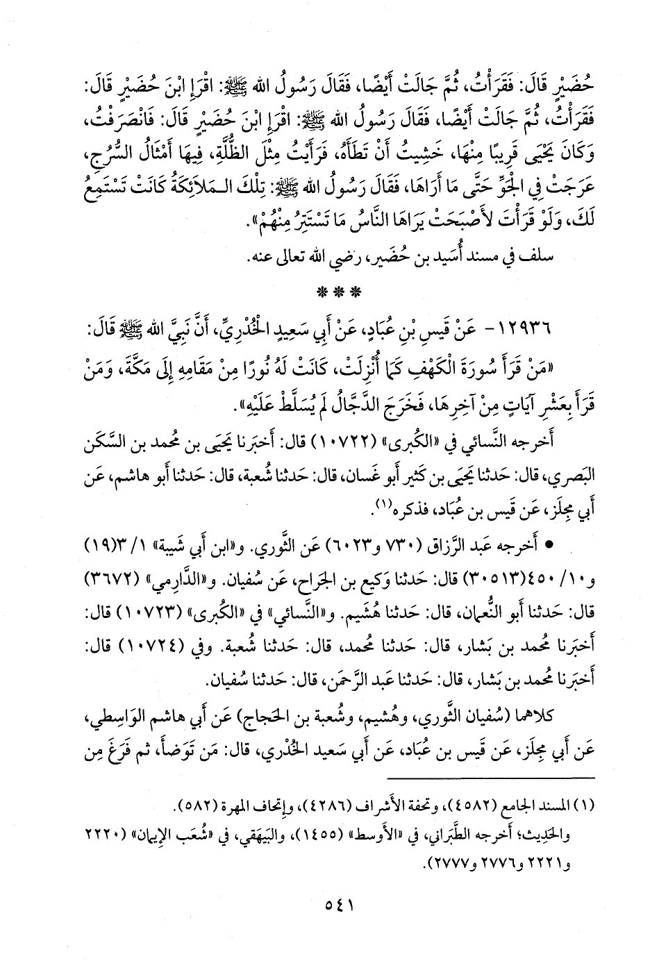 - وفي رواية: «عن أَبي سعيد الخُدري، قال: من قَرأَ سورة الكَهفِ ليلة الجُمُعة، أَضاءَ له من النورِ فيما بينهُ وبين البيتِ العَتيقِ» (¬٢). «موقوف».