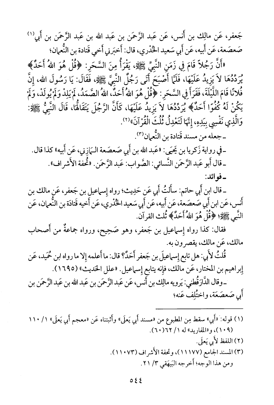 - قال عبد الرَّحمَن بن أبي حاتم الرازي: سألتُ أبي عن حديثٍ؛ رواه إسماعيل بن جعفر، عن مالك بن أنس، عن ابن أبي صعصعة، عن أبيه، عن أبي سعيد الخُدْري، عن أخيه قتادة بن النعمان، عن النبي صَلى الله عَليه وسَلم؛ {قُلْ هُوَ اللهُ أَحَدٌ} ثلث القرآن.