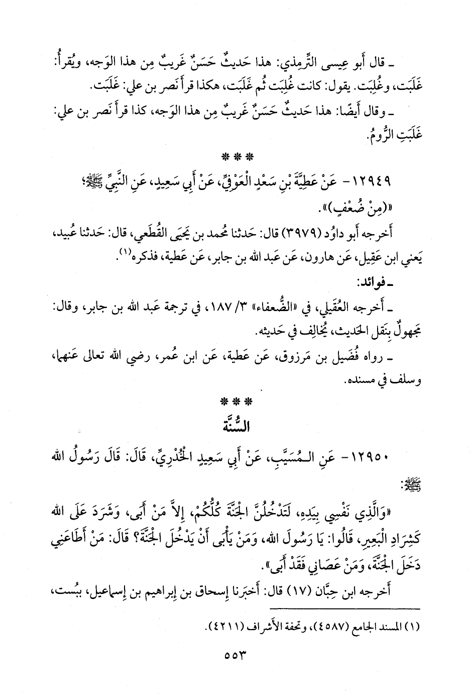 - قلنا: إِسناده ضعيفٌ؛ عطية بن سعد بن جُنادة العَوفي الجَدَلي الكوفي، شيعيٌّ خبيث، ليس بثقة، ومُدلِّس، كان يروي عن محمد بن السائب الكلبي، المُتهم بالكذب، ويُكَنِّيه بأَبي سعيد، موهمًا أَنه يريد أَبا سعيد الخُدْري، وإِنما أَراد به الكلبي. انظر فوائد الحديث رقم (١٣١٥٩).