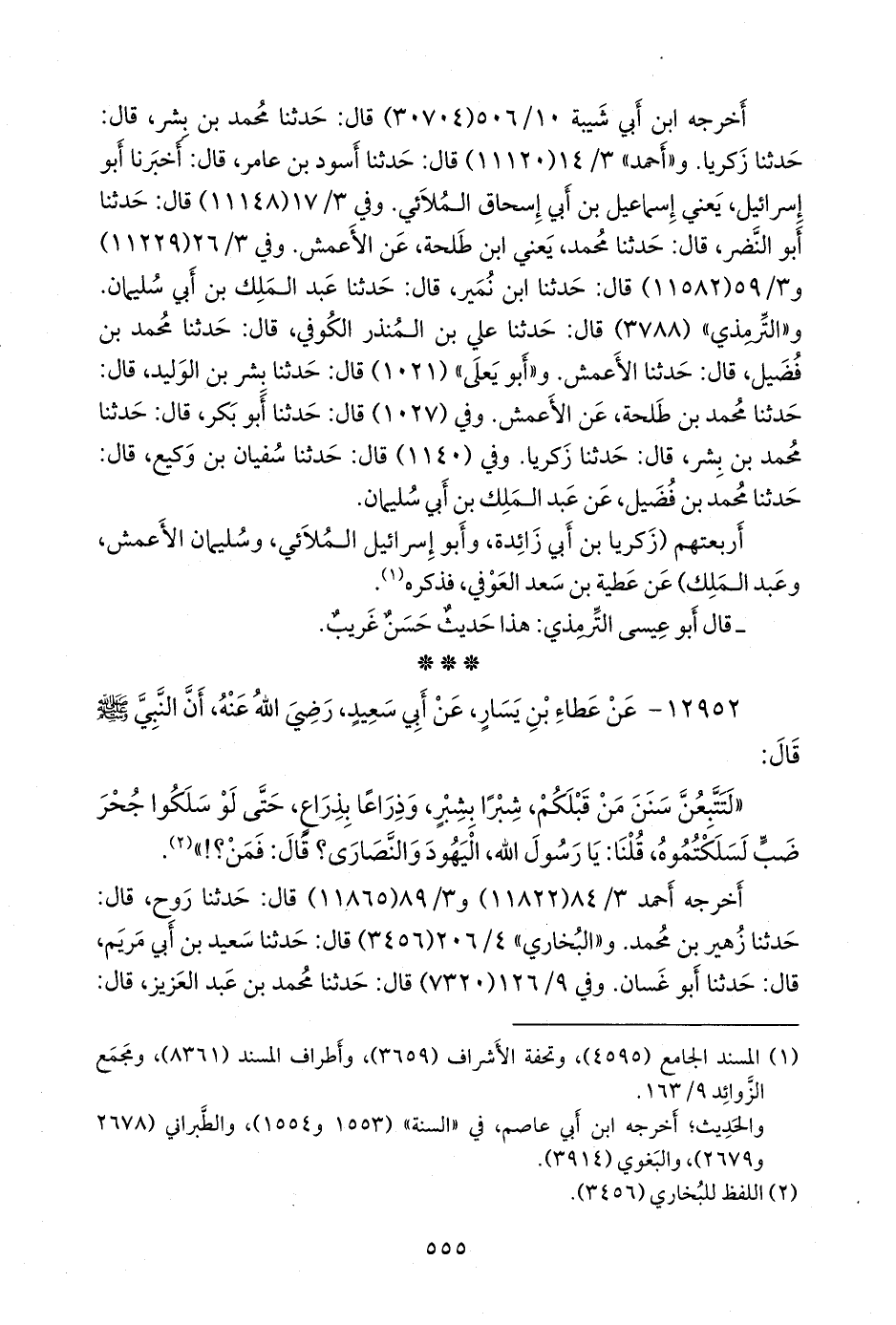 (¬٢) قال ابن الصلاح: قال مسلم في آخر كتاب القدر، في حديث أبي سعيد الخُدْري: «لتركبن سنن من كان قبلكم»: حدثني عدة من أصحابنا، عن سعيد بن أبي مريم، وهذا قد وصله إبراهيم بن محمد بن سفيان، عن محمد بن يحيى، عن ابن أبي مريم. «صيانة صحيح مسلم» صفحة (٨٠).