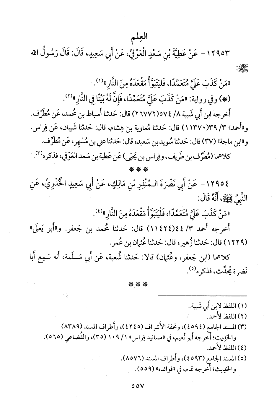 أخرجه ابن أبي شيبة (٢٦٧٧٢) قال: حدثنا أسباط بن محمد، عن مطرف. و «أحمد» ٣/ ٣٩ (١١٣٧٠) قال: حدثنا معاوية بن هشام، قال: حدثنا شَيبان، عن فراس. و «ابن ماجة» (٣٧) قال: حدثنا سويد بن سعيد، قال: حدثنا علي بن مُسهِر، عن مطرف.