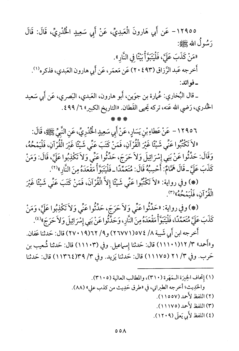 - وفي رواية: «حدثوا عني ولا حرج، حدثوا عني ولا تكذبوا علي، ومن كذب علي متعمدا، فقد تَبوأ مقعده من النار، وحدثوا عن بني إسرائيل ولا حرج» (¬٣).