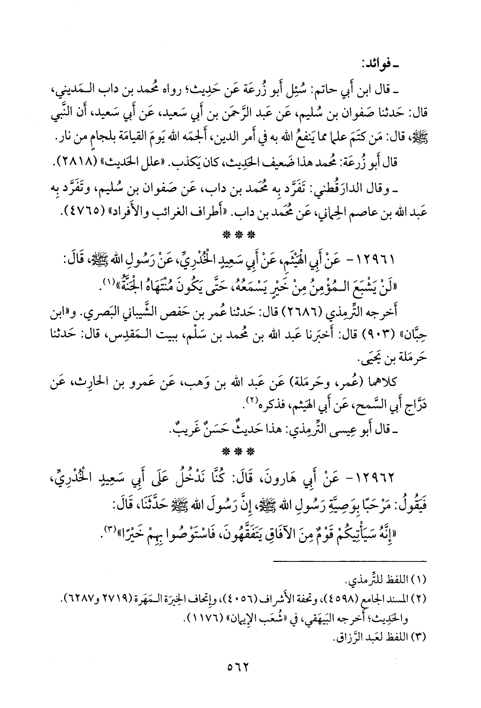 - وفي رواية: «عن أبي هارون العبدي، قال: كنا نأتي أبا سعيد فيقول: مرحبا بوصية رسول الله صَلى الله عَليه وسَلم إن رسول الله صَلى الله عَليه وسَلم قال: إن الناس لكم تبع، وإن رجالا يأتونكم من أقطار الأرض، يتفقهون في الدين، فإذا أتوكم فاستوصوا بهم خيرا» (¬٣).