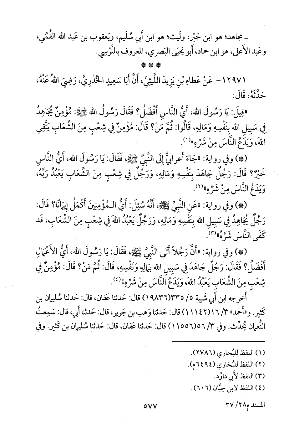- وفي رواية: «أن رجلا أتى النبي صَلى الله عَليه وسَلم فقال: يا رسول الله، أي الأعمال أفضل؟ فقال: رجل جاهد في سبيل الله بماله ونفسه، قال: ثم من؟ قال: مؤمن في شعب من الشعاب يعبد الله، ويدع الناس من شره» (¬٤).