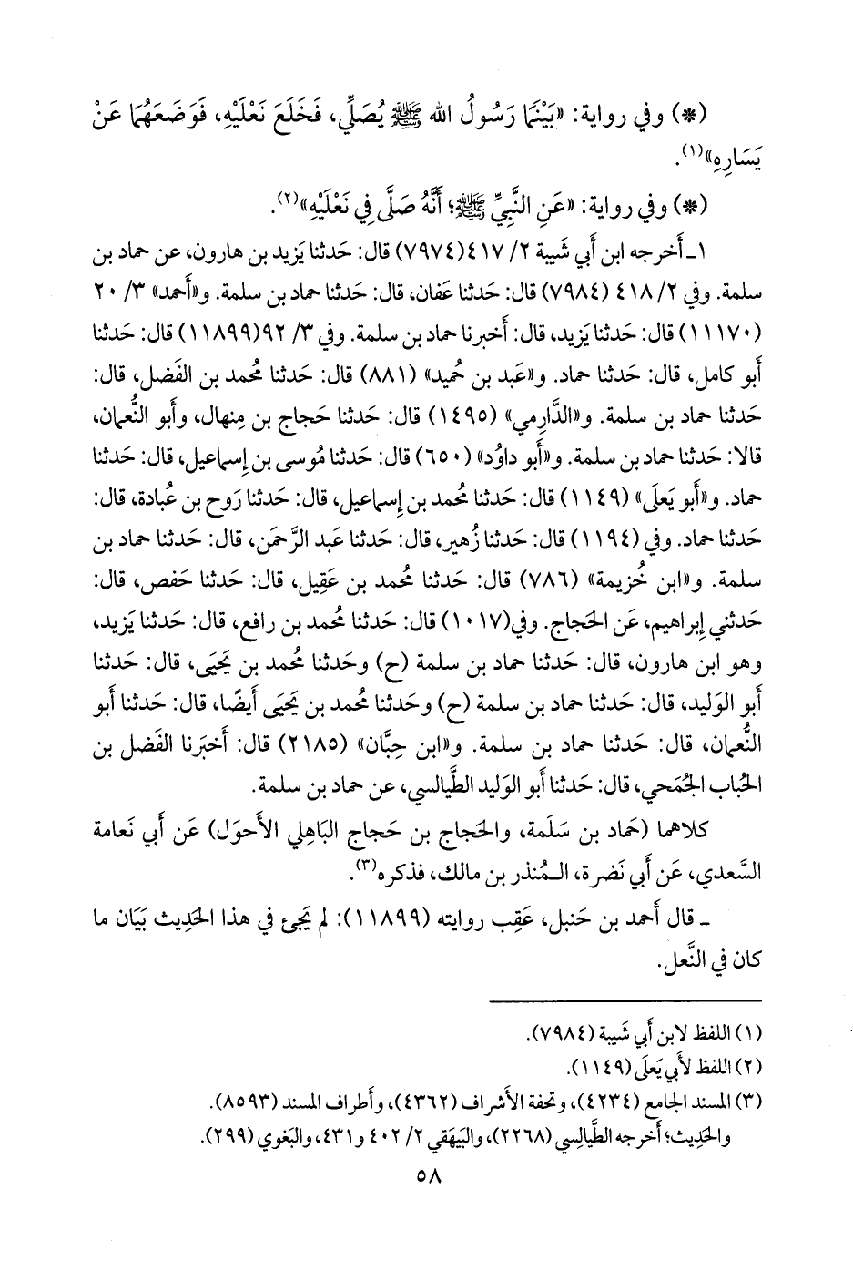 - قال أحمد بن حنبل، عقب روايته (١١٨٩٩): لم يجئ في هذا الحديث بيان ما كان في النعل.