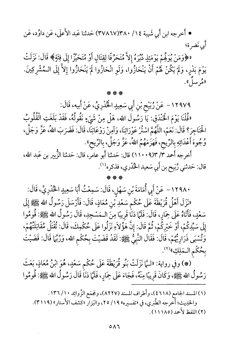 «نزل أهل قريظة على حكم سعد بن معاذ، قال: فأرسل رسول الله صَلى الله عَليه وسَلم إلى سعد، فأتاه على حمار، قال: فلما دنا قريبا من المسجد، قال رسول الله صَلى الله عَليه وسَلم: قوموا إلى سيدكم، أو خيركم، ثم قال: إن هؤلاء نزلوا على حكمك، قال: تقتل مقاتلتهم، وتسبى ذراريهم، قال: فقال النبي صَلى الله عَليه وسَلم: لقد قضيت بحكم الله، وربما قال: قضيت بحكم الملك» (¬١).