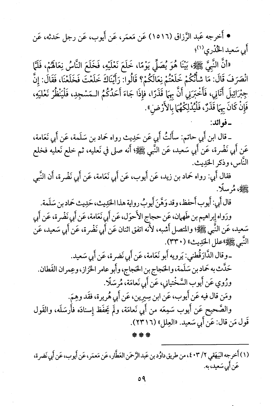 - قال عبد الرَّحمَن بن أبي حاتم الرازي: سألت أبي عن حديث رواه حماد بن سلمة، عن أبي نَعامة، عن أبي نضرة، عن أبي سعيد، عن النبي صَلى الله عَليه وسَلم؛ أنه صلى في نعليه، ثم خلع نعليه فخلع الناس، وذكر الحديث.