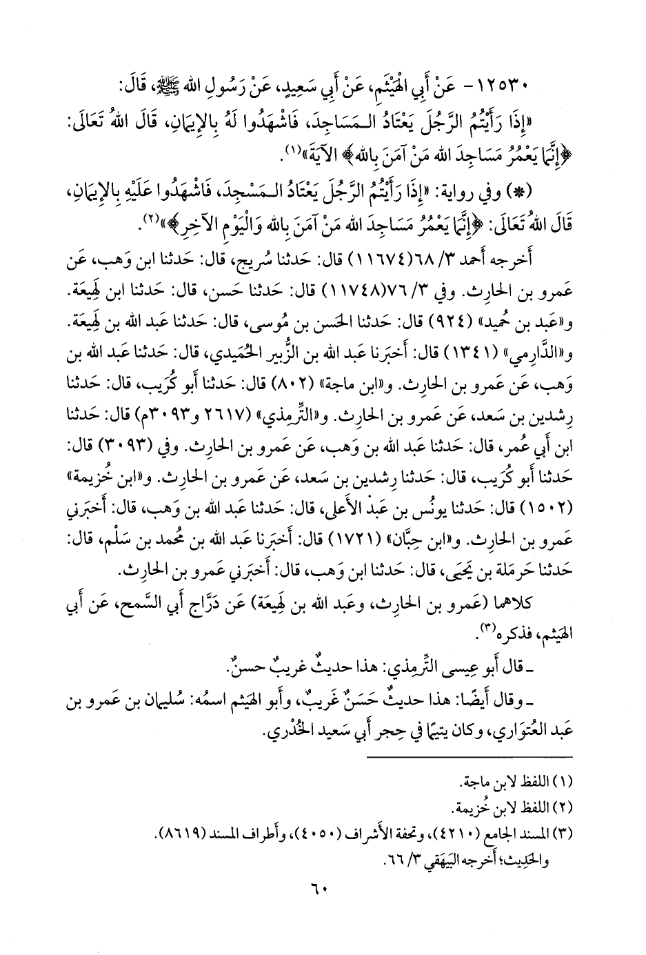 - وفي رواية: «إذا رأيتم الرجل يعتاد المسجد، فاشهدوا عليه بالإيمان، قال الله تعالى: {إنما يعمر مساجد الله من آمن بالله واليوم الآخر}» (¬٢).
