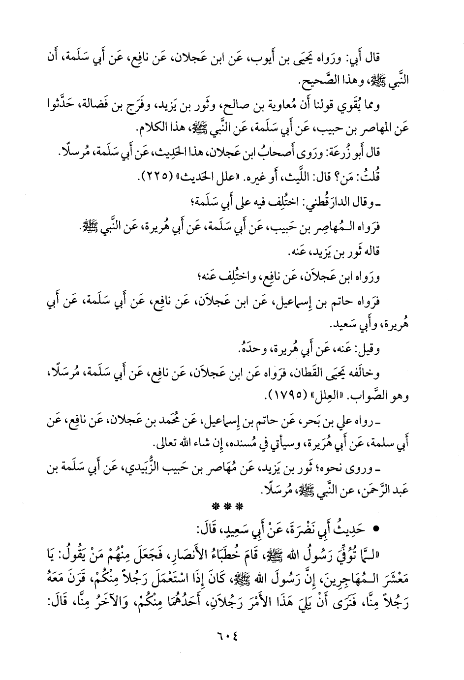 وخالفه يحيى القطان، فرواه عن ابن عَجلان، عن نافع، عن أبي سلمة، مرسلا، وهو الصواب. «العلل» (١٧٩٥).