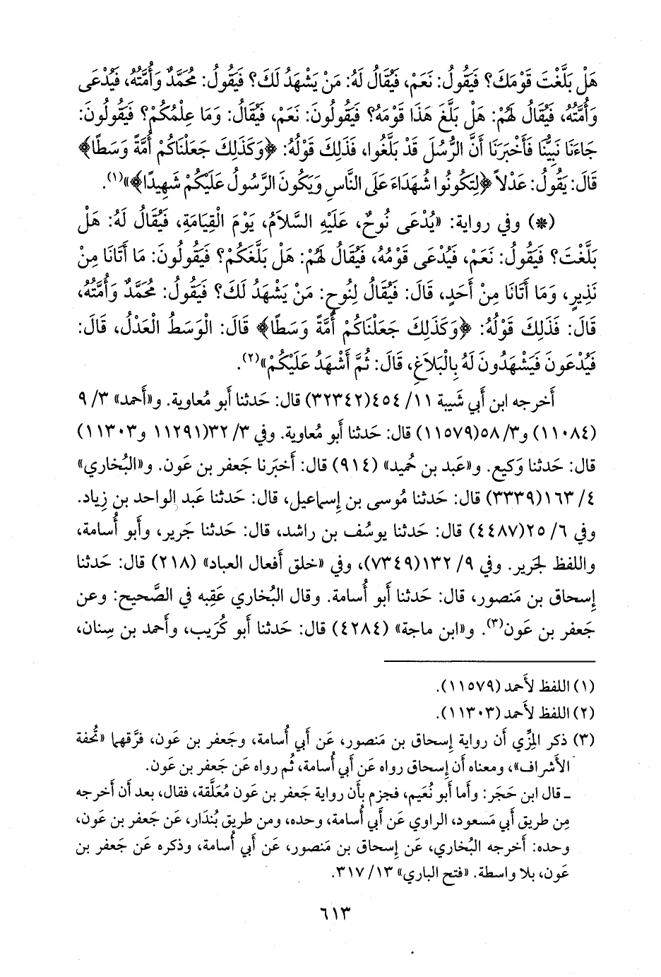 - وفي رواية: «يدعى نوح، عليه السلام، يوم القيامة، فيقال له: هل بلغت؟ فيقول: نعم، فيدعى قومه، فيقال لهم: هل بلغكم؟ فيقولون: ما أتانا من نذير، وما أتانا من أحد، قال: فيقال لنوح: من يشهد لك؟ فيقول: محمد وأُمته، قال: فذلك قوله: {وكذلك جعلناكم أمة وسطا} قال: الوسط العدل، قال: فيدعون فيشهدون له بالبلاغ، قال: ثم أشهد عليكم» (¬١).