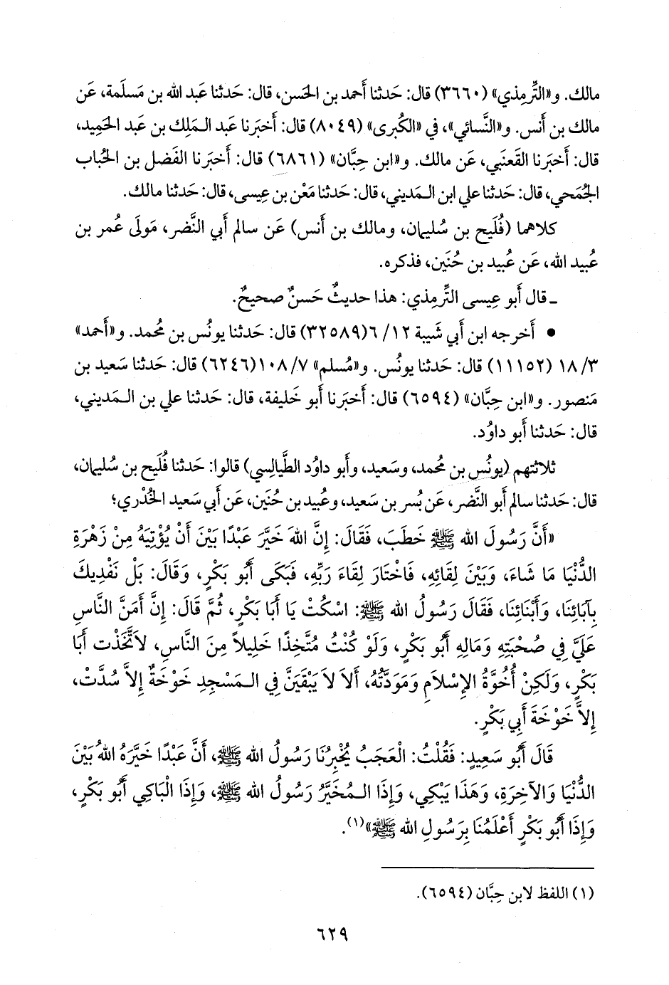 «أن رسول الله صَلى الله عَليه وسَلم خطب، فقال: إن الله خير عبدًا بين أن يؤتيه من زهرة الدنيا ما شاء، وبين لقائه، فاختار لقاء ربه، فبكى أَبو بكر، وقال: بل نفديك بآبائنا، وأبنائنا، فقال رسول الله صَلى الله عَليه وسَلم: اسكت يا أبا بكر، ثم قال: إن أمن الناس علي في صحبته وماله أَبو بكر، ولو كنت متخذا خليلا من الناس، لاتخذت أبا بكر، ولكن أخوة الإسلام ومودته، ألا لا يبقين في المسجد خوخة إلا سدت، إلا خوخة أَبي بكر.